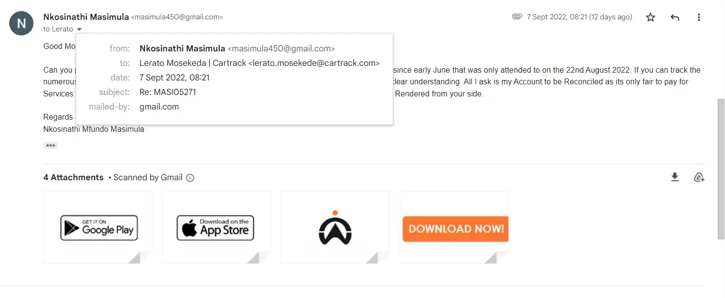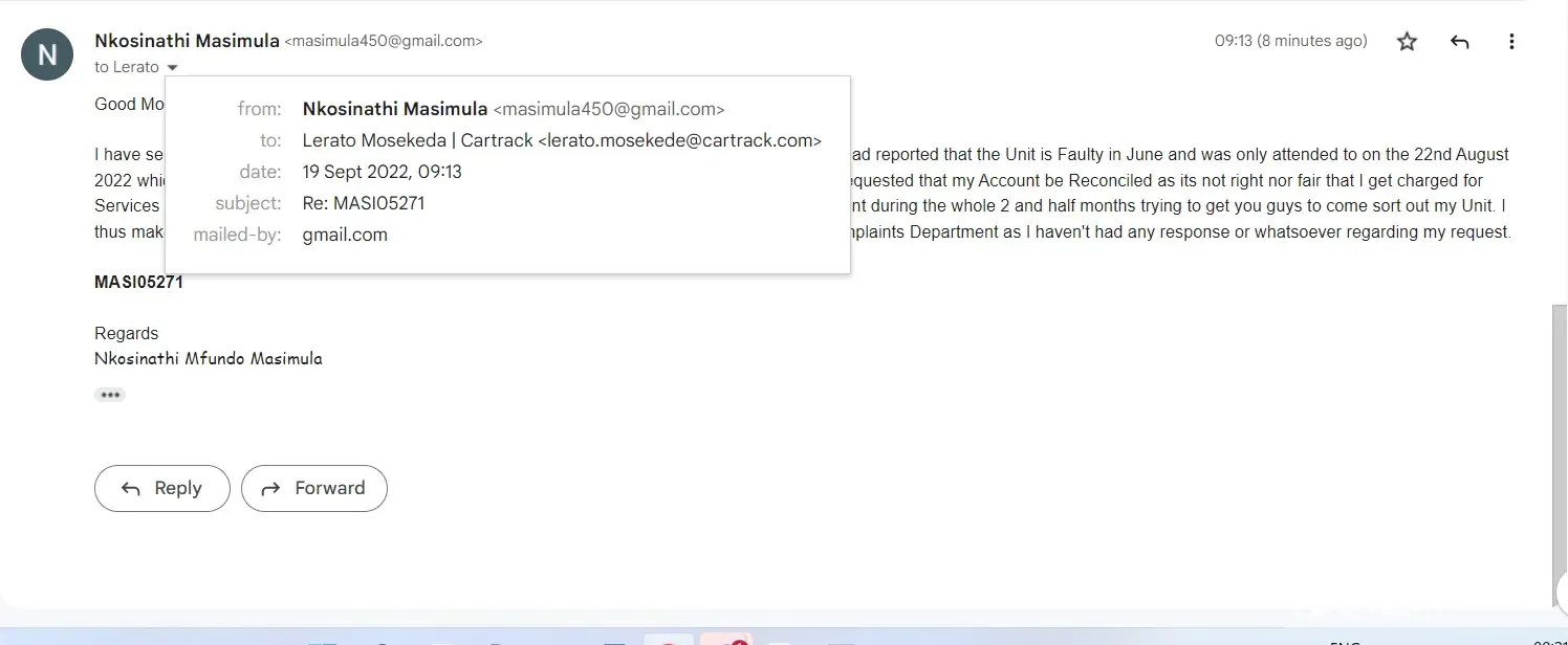 I am deeply disappointed with Cartrack service since I joined them. I have been with them for the past 23 months and only stayed because of the contract. Cartrack will never communicate. If you go to an area that you have never been to before they don't send a notification to show you that the car is always under surveillance or around the clock monitoring is active.They will never call to ask if you are safe. Cartrack never send notifications of high risk areas. They have just been collecting money from me. Last night I had to use the manual key because the battery for the key was flat. The alarm went off and screamed until it had tears but they never even noticed. So what kind of a vehicle tracking company is this, that makes you aware that they don't exist? I hope they don't renew the contract automatically without my concern. I am going back to the competition who were streets ahead in terms of service delivery. Disgruntled but going. Pakiso Mphuthi