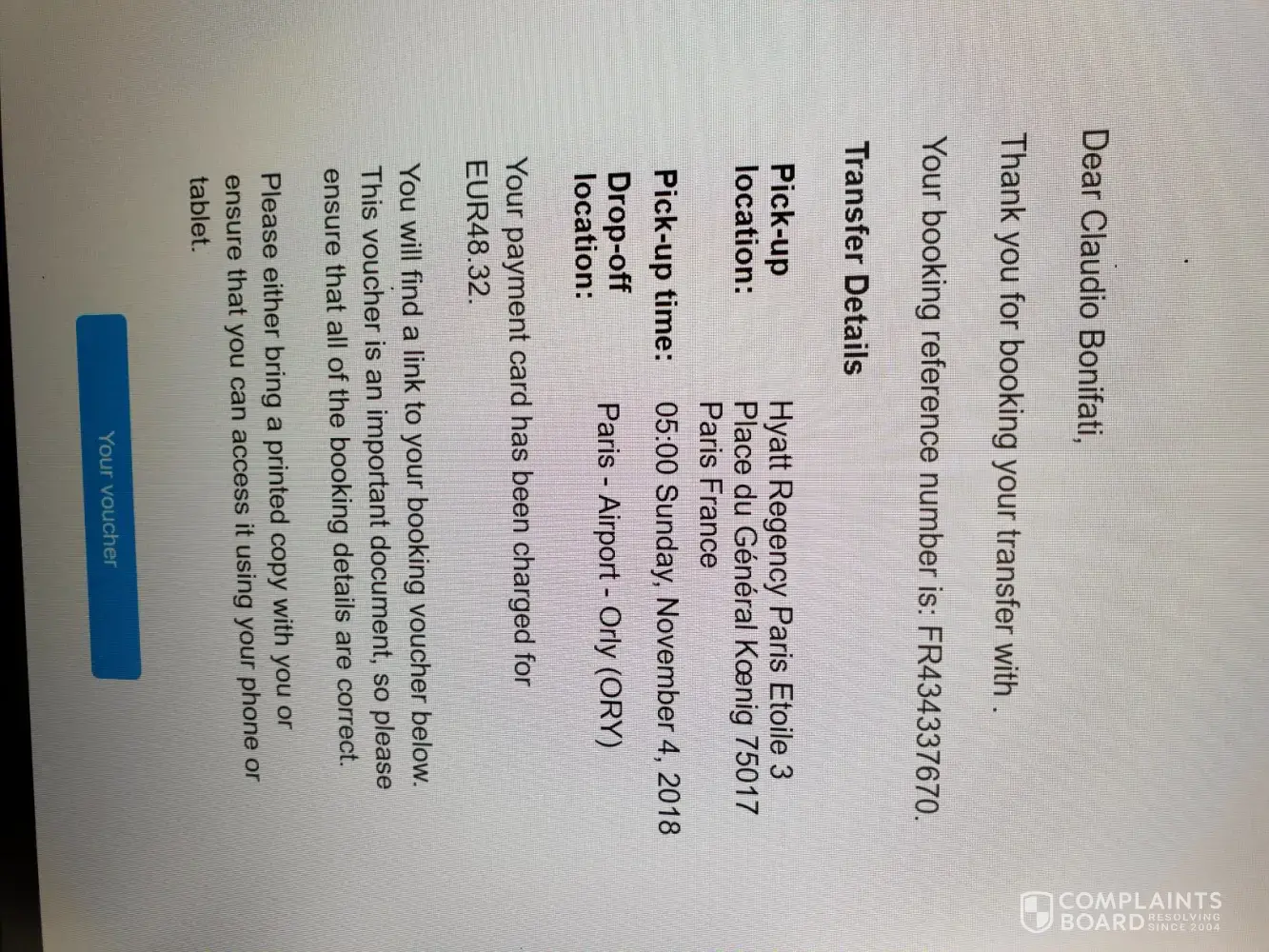 On 4 October I booked a car for a transfer from the hotel to Paris - Airport - Orly (ORY) (N° of reservation FR434337670). I paid with my credit 48.32 euros (transation results ok in favour of Et* online Transport).