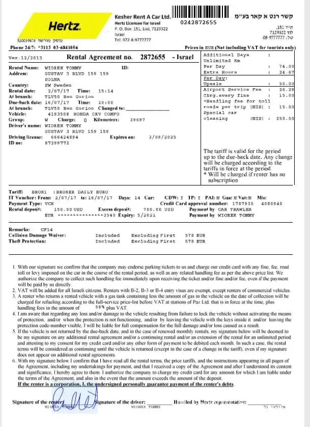 Please also see the answer from Hertz below that confirm that I am entitled to the refund promised by you! Also attached rental agreement.