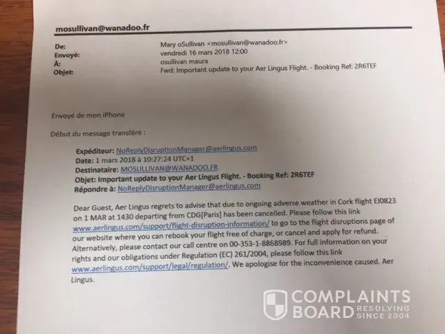 This booking had to be cancelled due to snow storm and cancellation of the Aer Lingus flight from Paris (booking ref 2R6TEF) also on March 1. Booking cancelled directly on website. Impossible to join any Aer Lingus staff directly as phone calls remained unanswered (staff not available due to weather conditions. I was expecting this cancellation to automatically generate a refund. As this has not happened, am now requesting a confirmation as to when this cancellation will be refunded.