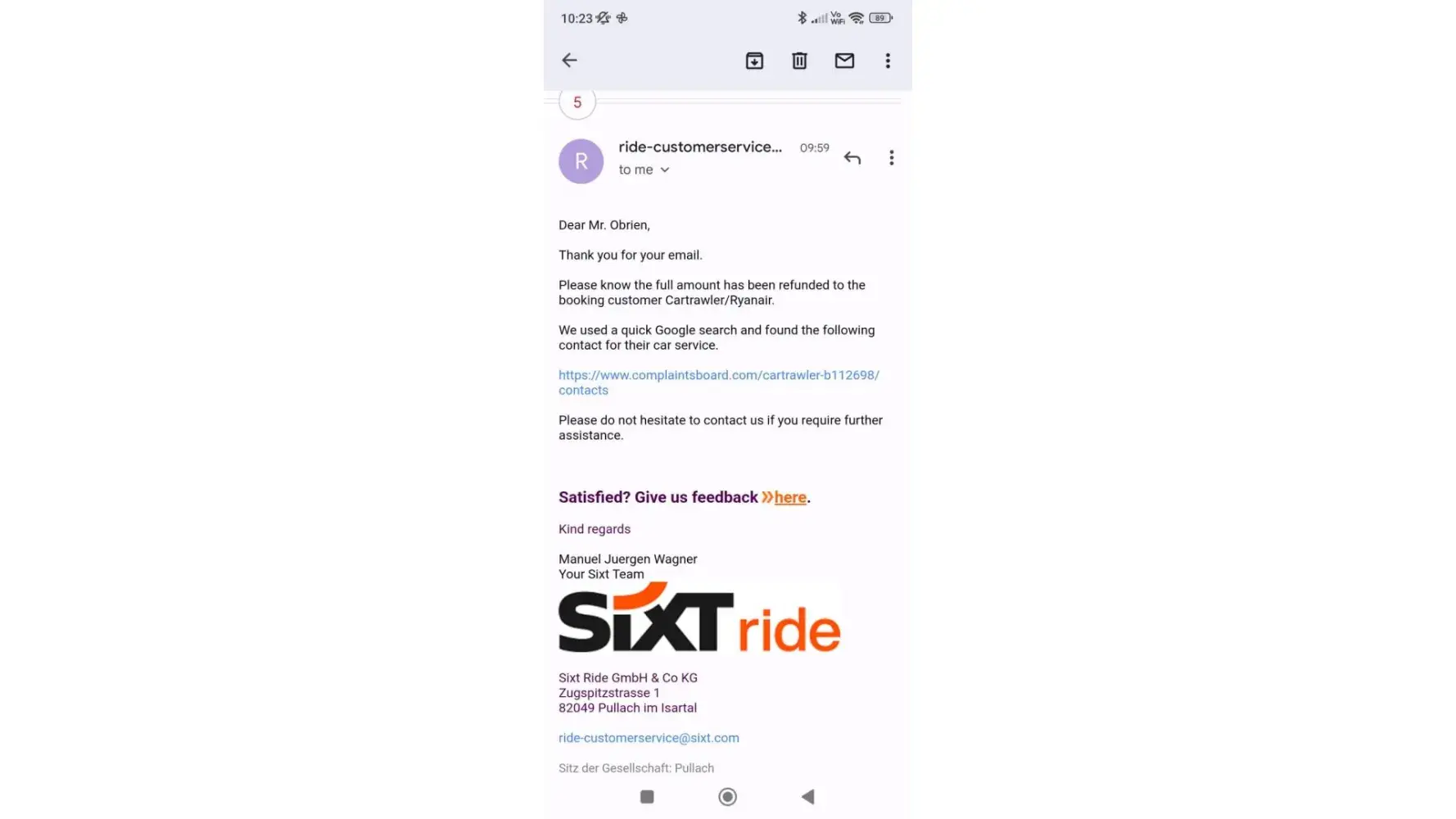 I then sent another email to [protected]@cartrawler.com as advised on their website also on the 26th Dec and on the 5th January - to this date received no response or follow up on my feedback / complaint.