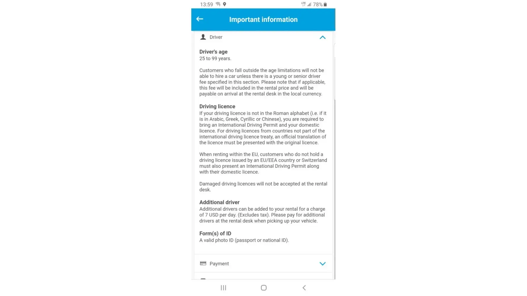 During booking process it says I need a valid driving license, a valid phone ID and a credit card in my name, which I have.