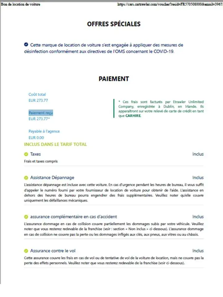 On the 06 Nov 2021, I rented a car through the website: www.ma-location-voiture.com, with the reference: FR570508000 (See annex 1). Of note, this website is in fact run by https://cars.cartrawler.com and appears debited by CARHIRE IRL.