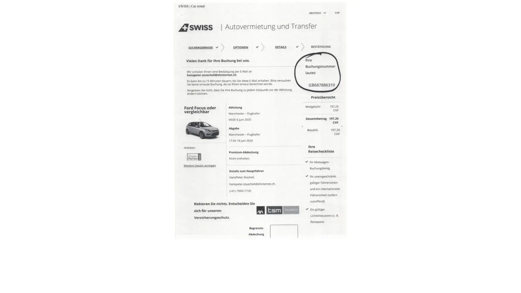 The reservation details are to aid you to find my contact details: (#6987299) Car hire Ref: ZA787272390