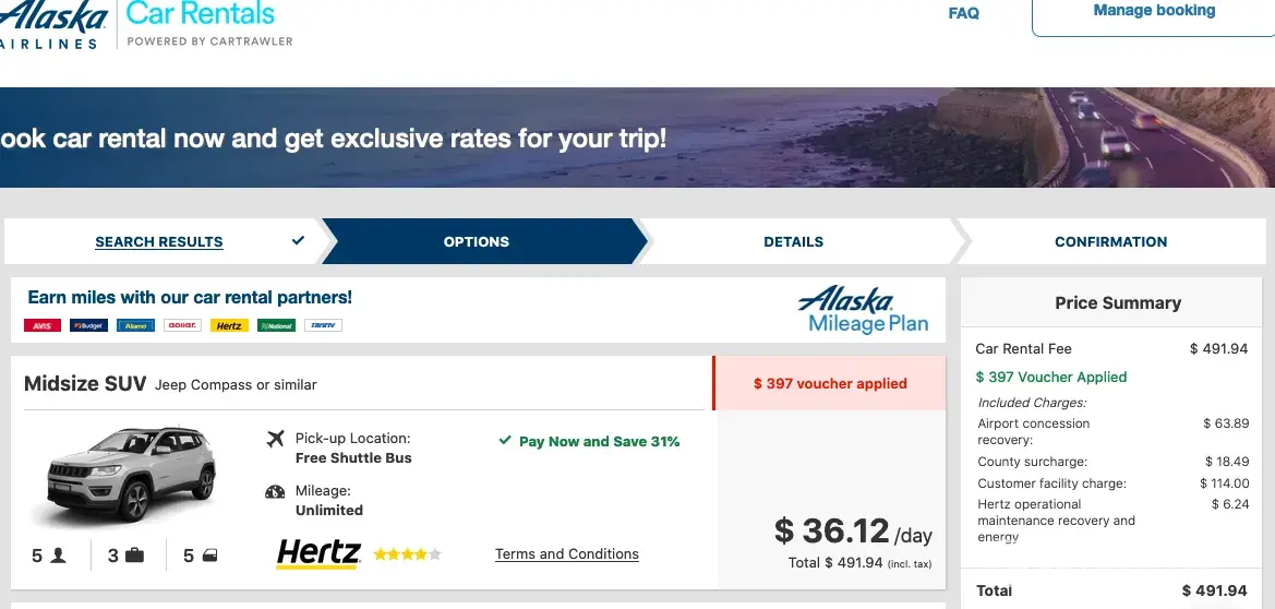 Please find attached screenshots of what I was working with in today's booking attempt. Again, Hertz shows the full voucher amount being applied and the other's only $1. When I proceeded to purchase what showed to be a booking for $491.94; once I hit confirm the amount changed to $888.94. I have contacted my credit card company and canceled the $888.94 charge. I have also called Alaska Air and shared my very disappointing experience. I have lost track of how many days and hours I have lost trying to book with this company, it has been extremely frustrating.