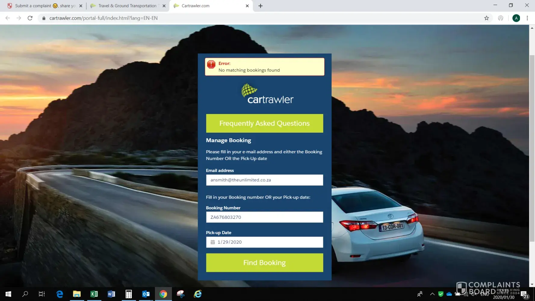 I booked a car hire with CarTrawler on the 24th of January- for pick up on the 28th (Lanseria Airport, South Africa).