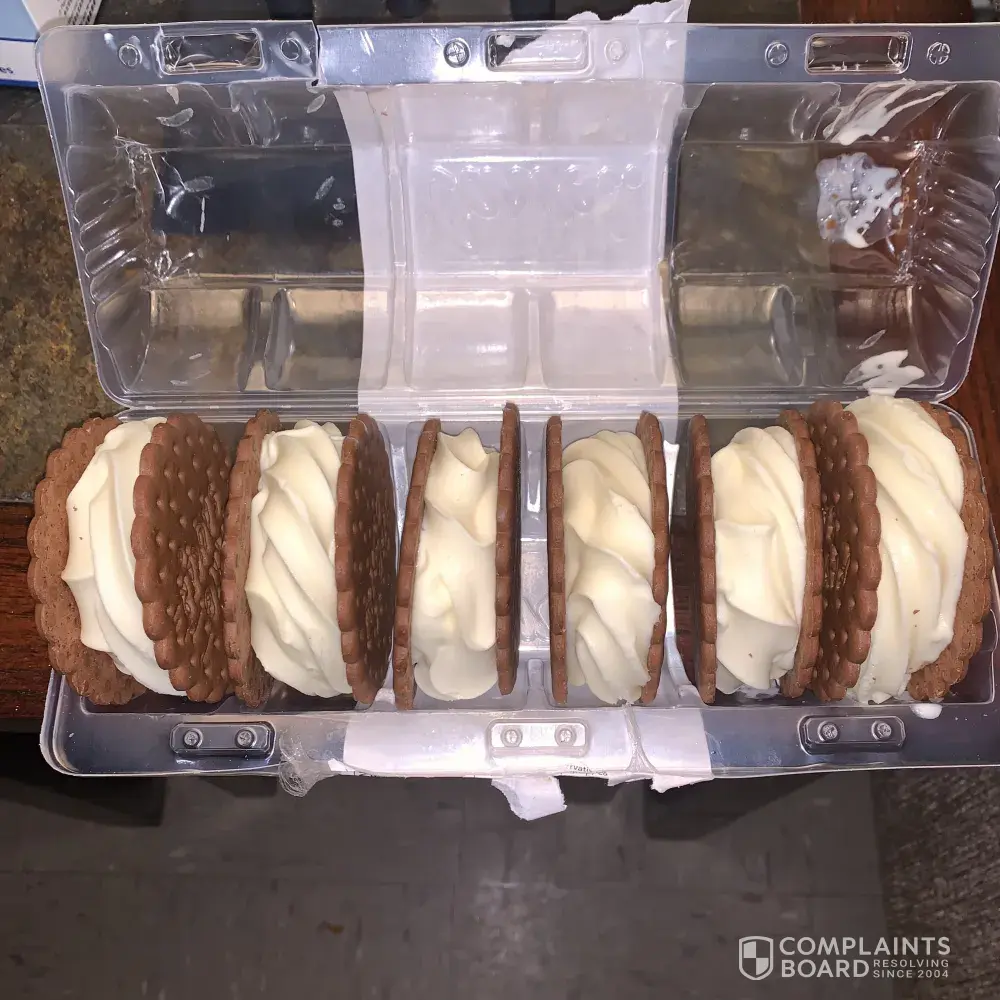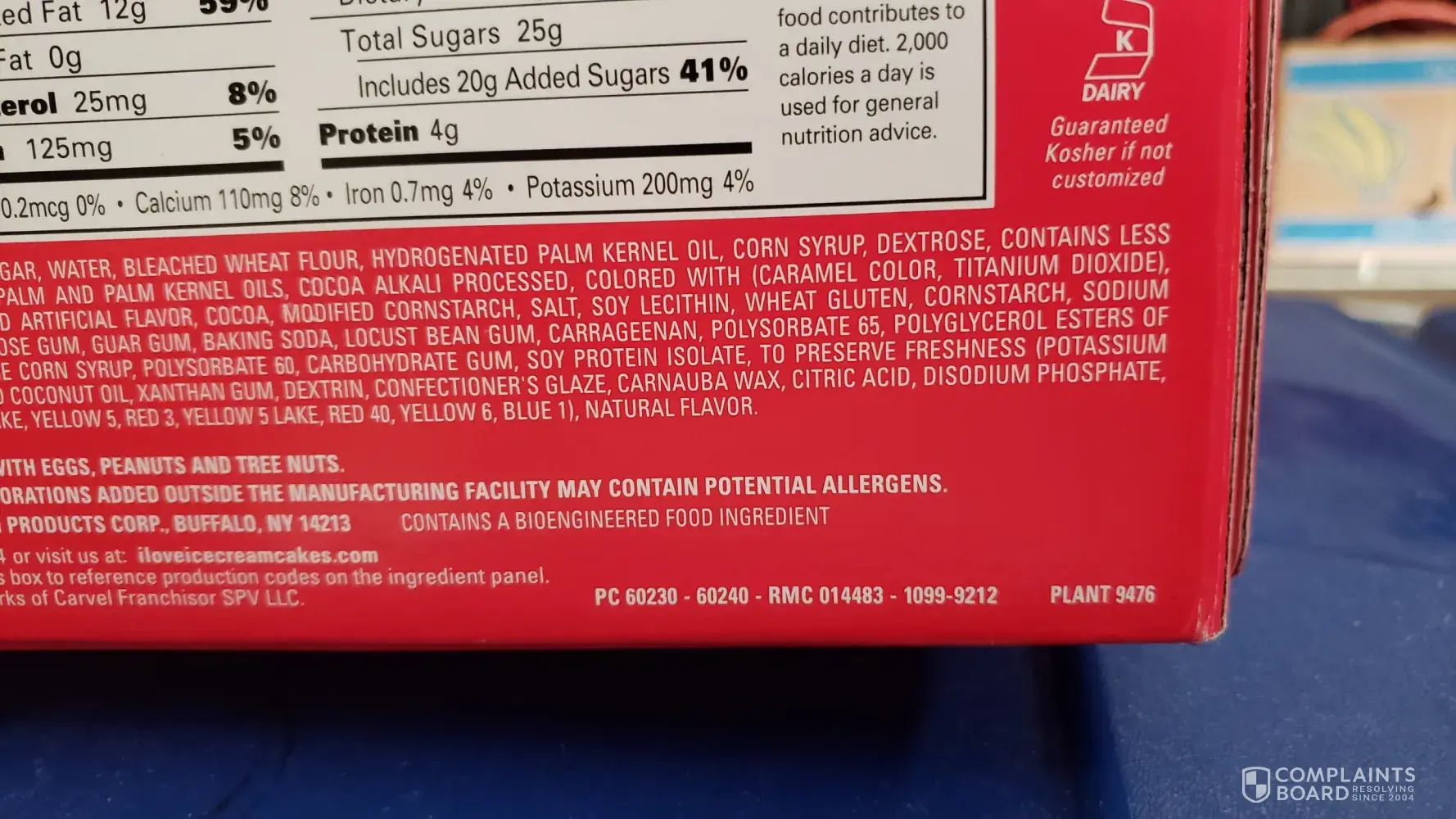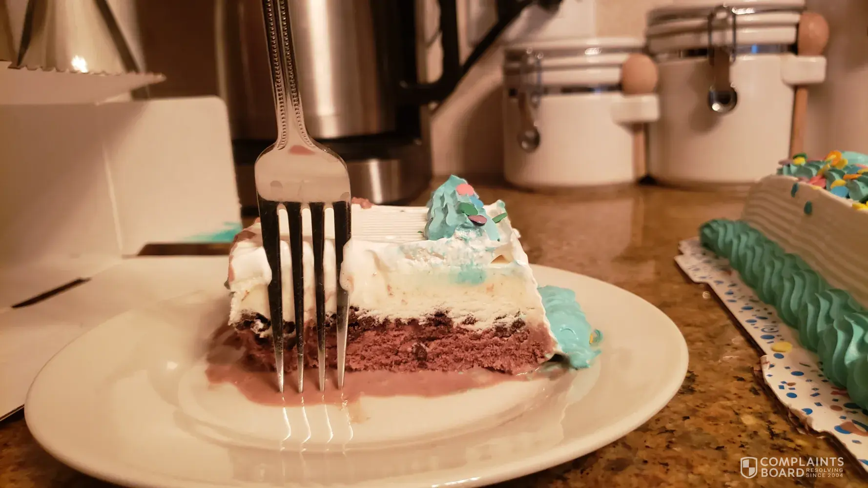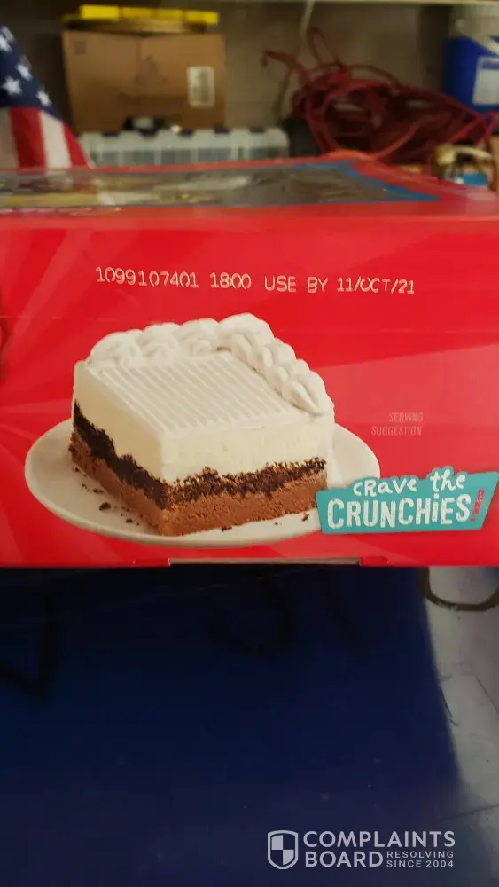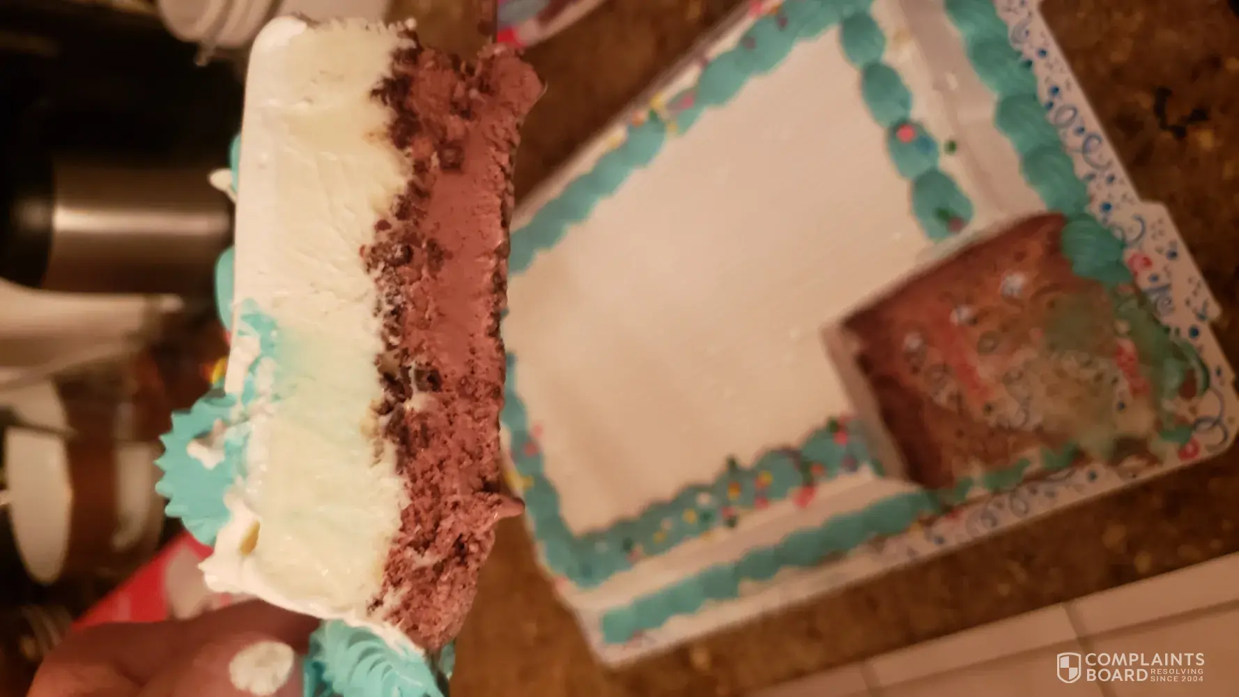 VERY disappointed - have been eating these cakes most of my life. This was the worst cake ever - just put most of it in the disposal. Somehow, the frosting has changed - it was gluey more like egg white - practically no vanilla ice cream & very thick crumbles - it was awful. i have been purchasing these cakes for years - this was terrible. It was not old, spoiled or melted - I bought it at Walmart. We have a bunch of winter birthdays & I'm not sure I want to even purchase another & we always buy them. Beverly Dornford, 150 Lyceum St #106, Geneva, NY 14456 GO BILL'S! Code on box RMC 014473 Thank you!