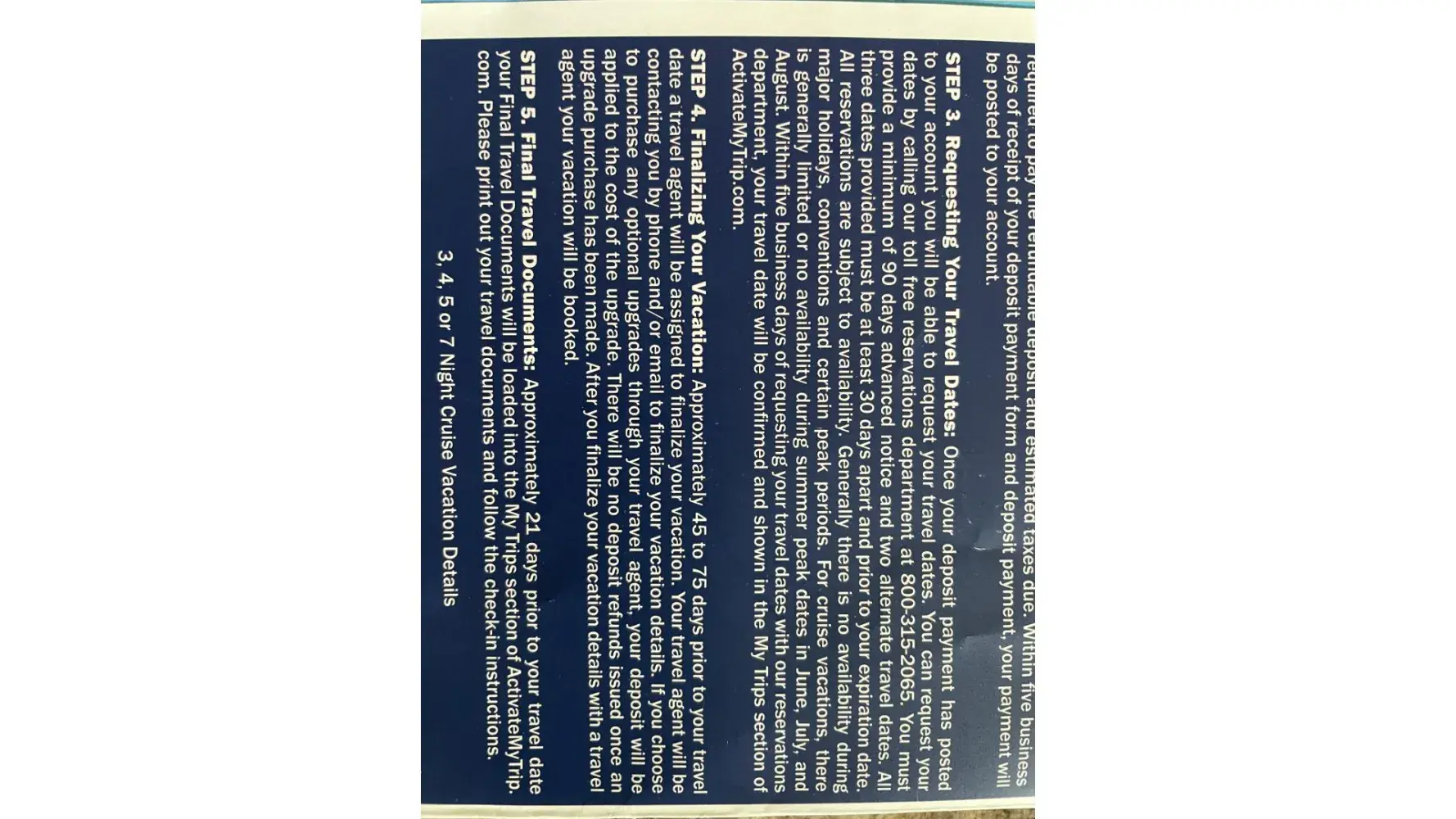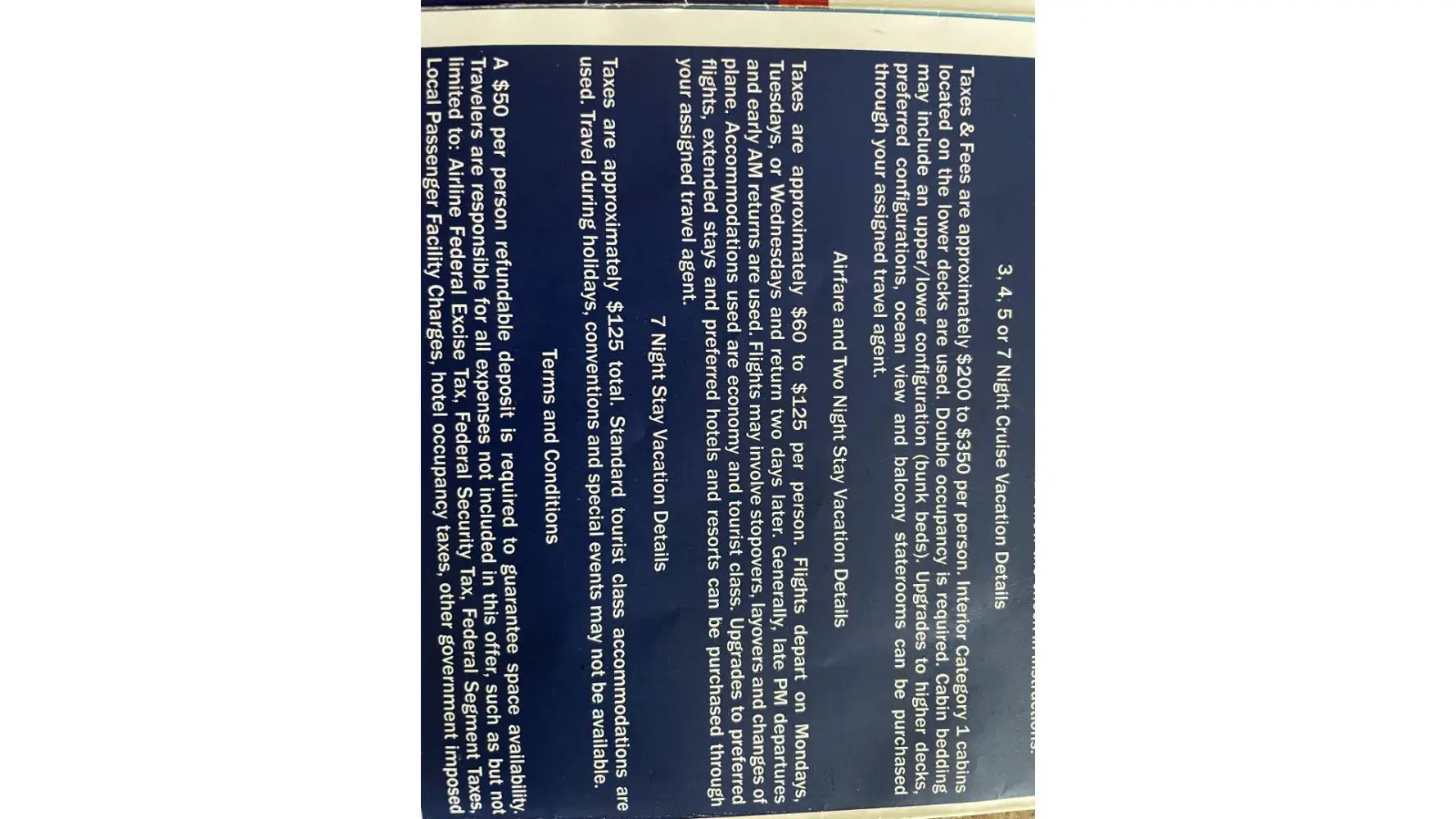 My girlfriend and I had to send out a deposit of $100 in order to redeem for taxes for the promotional trip. We recieved a letter confirming they received our deposit on February 24, 2012. They picked and scheduled our trip date for July 11, 2012 confirming our reservation for travel on that date. they called several times pushing us buy an upgrade for $500 with a room being on the Vegas Strip as oppose to a room 15miles away from The Strip.