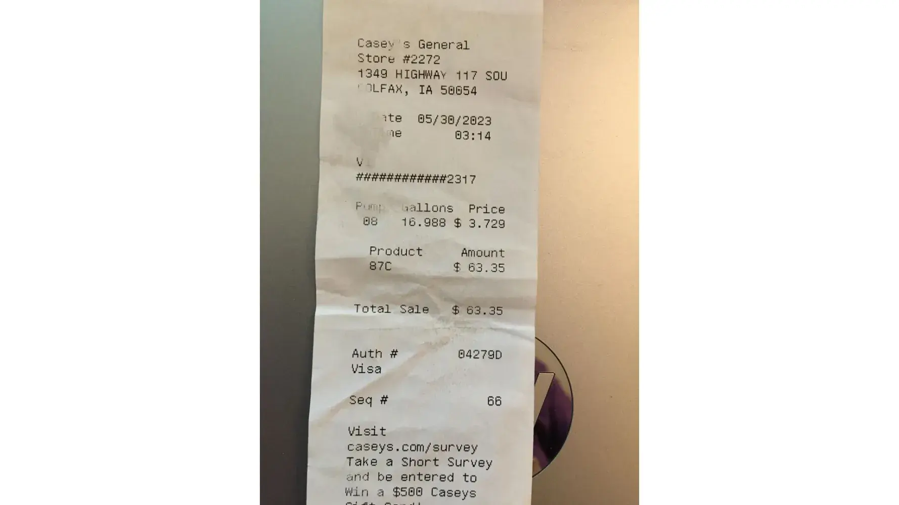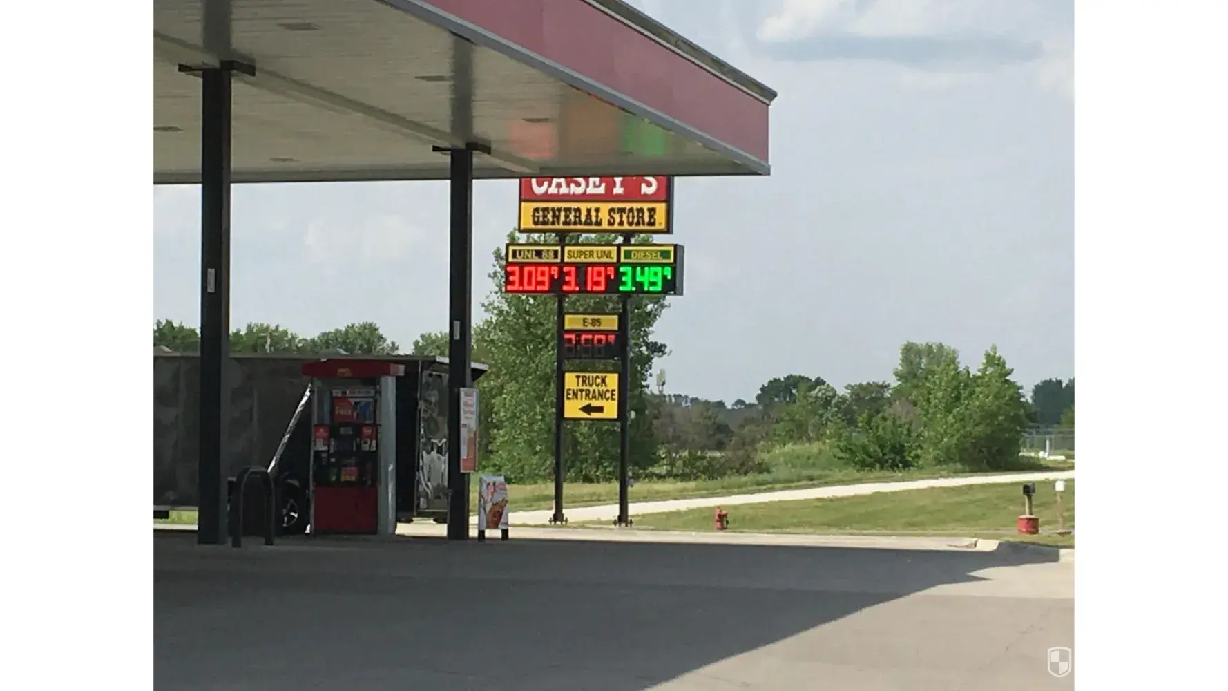 On May 30 we stopped at a Casey's Gas Station. The sign said gas prices were as follows: lowest grade $3.09, super unleaded $3.19, Diesel $3.49. My husband filled our tank, I looked at the receipt, and we were charged $3.729.