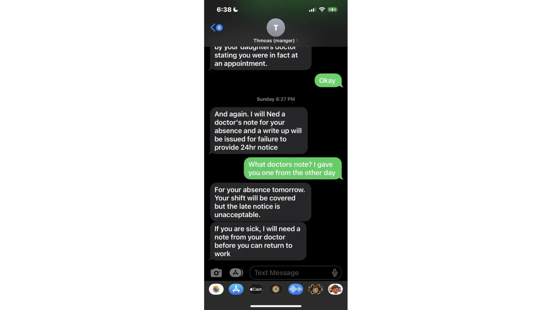 1st photo ; The photo to prove he told me I couldn't come back to work without a doctors note 2nd photo ; The day after he told me to come into work.