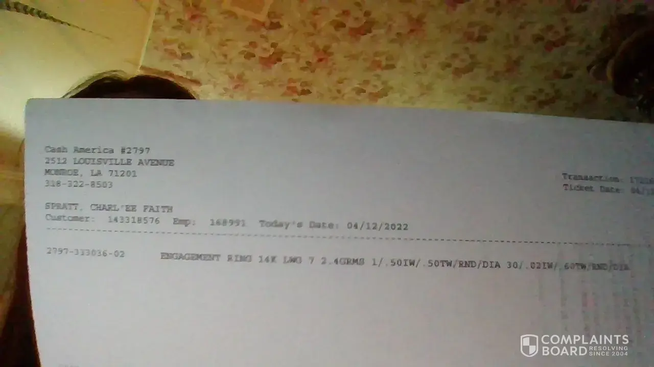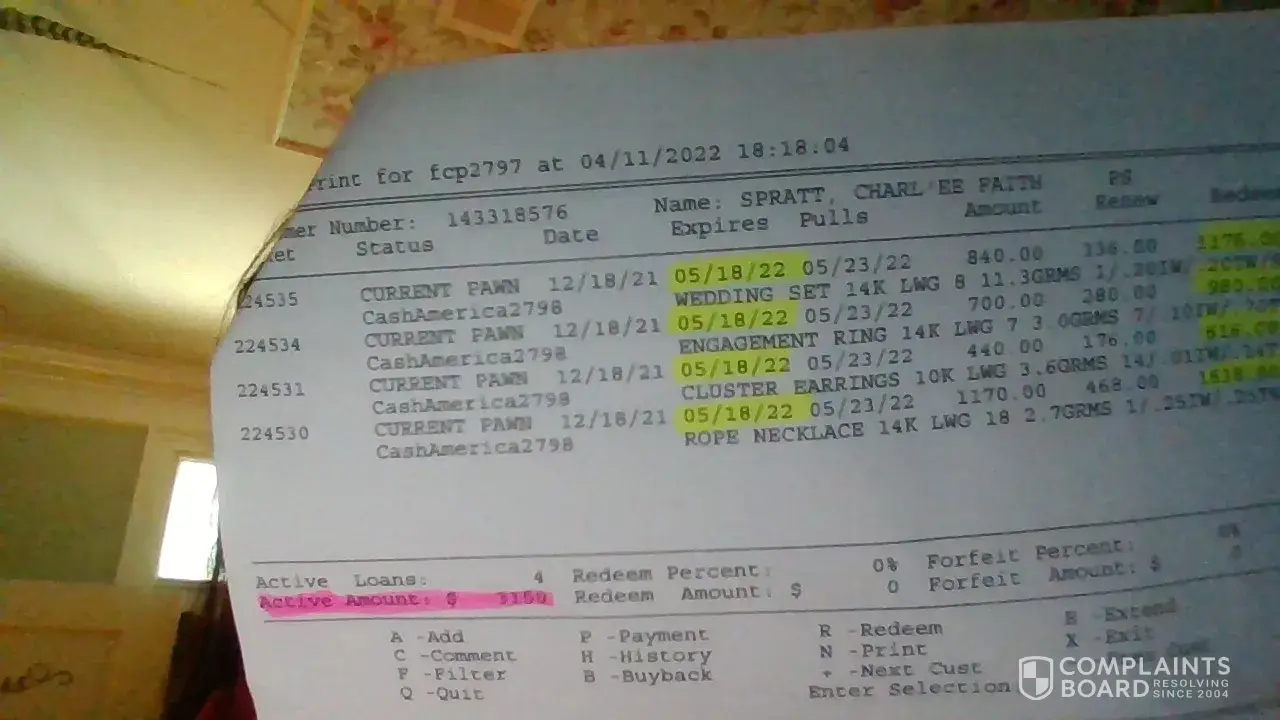 My name is charl’ee spratt my husbands name is christopher spratt. He went into the cash america pawn located at 2512 louisville avenue monroe louisiana 71201, on 11/26/2021 and got a loan on 3 rings. They are on three separate tickets. The maturity date was 2/26.2022. He went in and paid one month and the next payment was not due until 3/26/2022 while he was in the store he ask to pay my pawn also. They said everything was fine. He was at work on 3/26/2022 so he called and ask if I could come in and pay it on the 1st. They said sure no problem. I went in on the 1st. They said there was nothing due but 800 which was a different loan. I also ask about my pawn. I was told nothing was due on mine. So I paid the 800 and went home. I told my husband and he said he would take care of it when he got home, since they said everything was fine. The pawn tickets for the three rings that I was told nothing was due on, that I ask to pay the 400 on is: 332580,332581, 332582. Due to this error.. This pawn was forfeited is what I was told. After I threw a fit. They said oh well we still have the rings if you want to put them on layaway. So I did. And I was charged all the interest that was on the pawn, even though I had lost them and then charged tax on the interest and layaway. That layaway number is under my name charl’ee spratt ticket # [protected]. When it was forfeited it was in my husbands name christopher spratt. And the pawn in my name that me and my husband kept asking if anything was due, and assured no, everything is fine with yours. That ticket number is 333036, when they finally told me that my pawn was gone because I forfeited it, even though it was asked about numerous times. My earrings and matching necklace that I paid 5200 was sold. The other rings I was told my other two rings were in display case. I bought one. It was priced 600 but since im the one that lost it, they charged me the interest for it also. That transaction number is [protected] and customer number is [protected]. And my husband got the other one for me. These have the price sticker still on them. The ring he got still has the display sticker of 300 but he was charged our interest too. The original ticket number was 333036 and when he bought it, that transaction number is [protected] and customer number is [protected]. He was charged 80 interest on a ring from the display. I had another pawn. And it was forfeited also. At this time, me and my husband have an active pawn there. My brother died of covid and I need money to bury him. So we got a loan of $4000 and due to all this, I ask them what I need to do to save the rest of my stuff, could I put it into layaway. They said yes, as soon as it is forfeited on the 11th, they can convert it to layaway and they will add 4 months interest and tax and the total layaway will be 7955 plus tax. And im supposed to go in and ask for justin because the manager doesn’t work on wednesdays.. How can they charge interest on things supposedly forfeited. And not just that. Tax on the interest. And I also have a pawn ticket that says that my necklace and earrings were still an active pawn when I was in there on april 1st asking to pay my pawn and it just seems like someone in the store wanted them and this is just wrong on so many levels. Those were heirlooms and it hurts because we tried so hard and we are still trying and I need help please. I’m enclosing pictures of my pawn they said was gone. But on the 11th it was active. But on the 12th I was buying some of it back out of the display case. They can’t tell me that my necklace and earrings were gone, when it was active when I was in there asking and buying some of it back. Something is really wrong here.