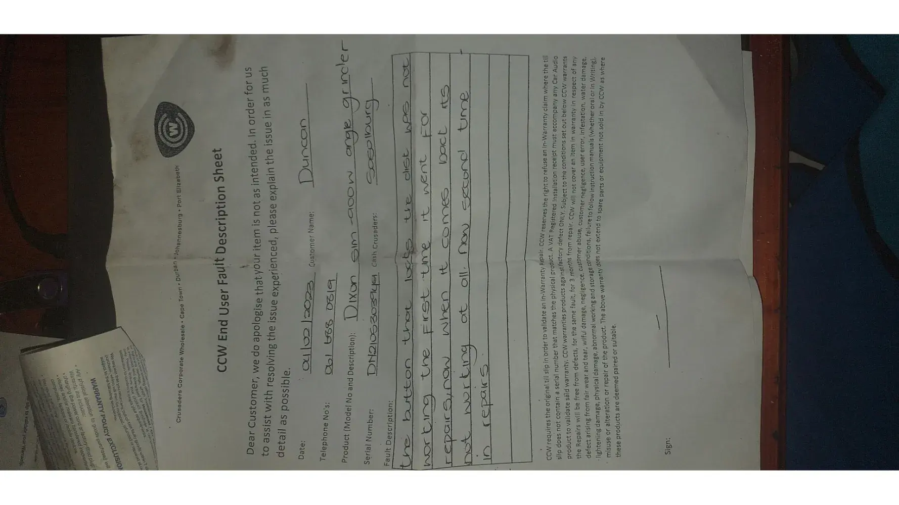 The the button thats locks the disc to take out wasent working. I took in in for repairs at cash Crusaders Sasolburg on January 2023, thay send it in for repairs and in February 2023 thay called and it wasent even working stil. Sended it back for second time and stil gives me problems.