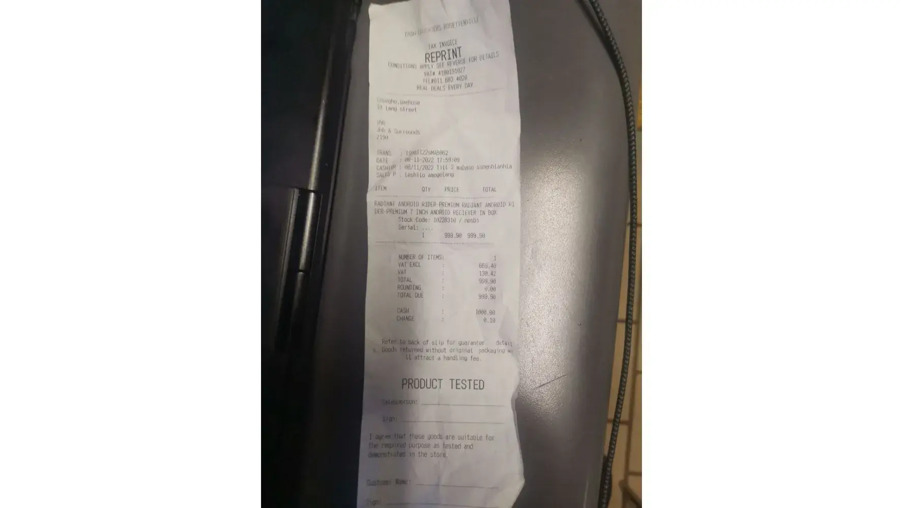11. The next day I was informed that the tape was booked in incorrectly and that it should have been reinstalled and because it wasn’t reinstalled they can’t exchange or send away for repairs because the date of installation differs from purchased date, I explained to the lady (staff member) that the plugs is the same and the make of the tape is also the same and that the product was tested by a staff member after I bought it and it was working.