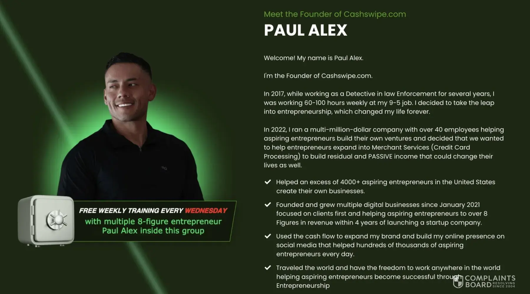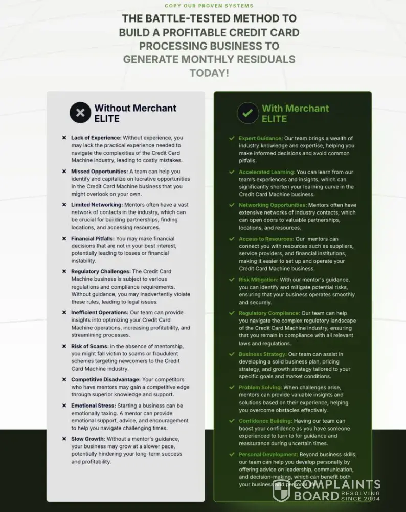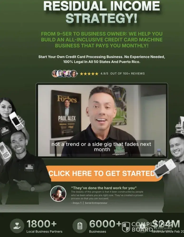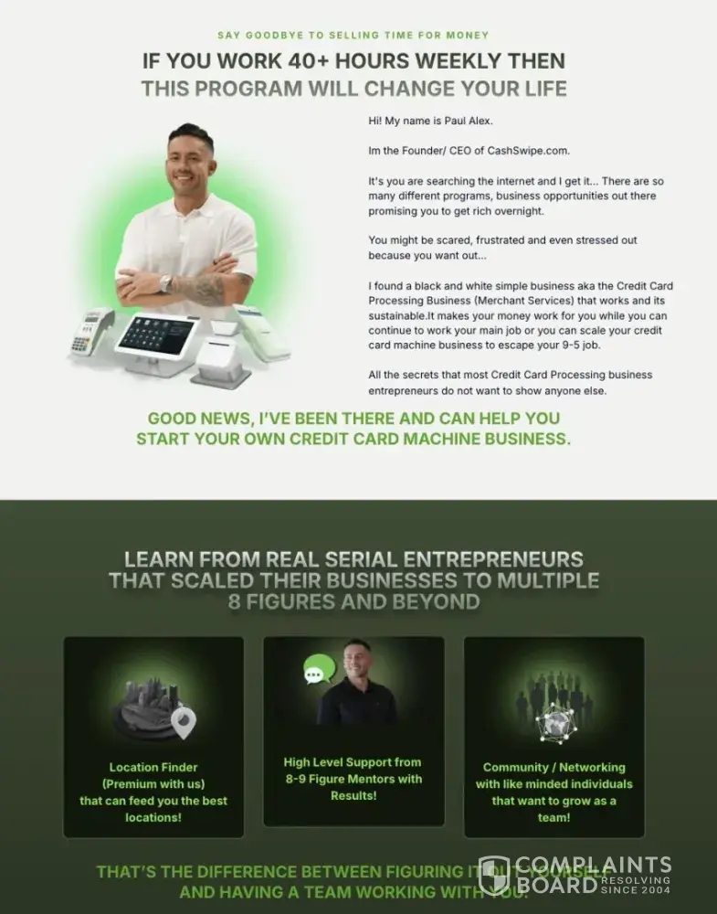 - They blanket advertise helping 1,800+ clients successfully start/launch/build businesses with the "exact blueprint". Successfully start...or start (and sustain) a successful $5k+/mo business? (Which means his little onboarding course instructs people how to open an LLC and the basics like what a terminal and a POS is). What does "help" mean, and what percentage of those 1,800+ clients are actually running successful businesses because of Cash Swipe's exceptional program? Also, they still use a same handful of stellar testimonials in 2026, which have been re-used for 2+ years now).