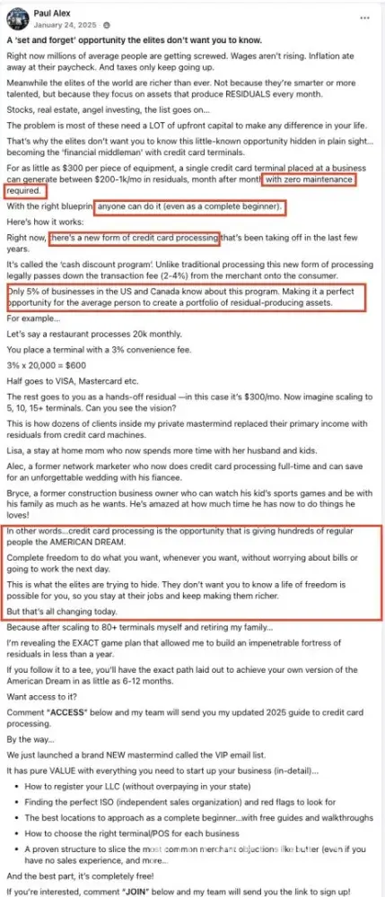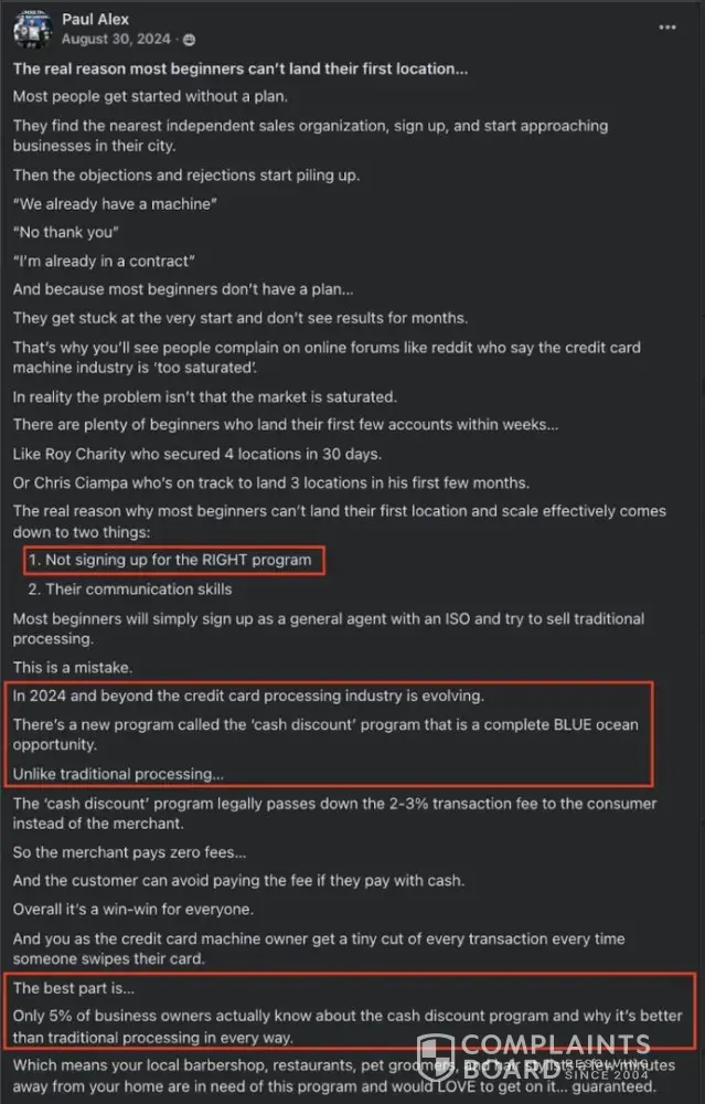 They also make deceptive claims that (in their words) other ISOs "suck" and their 'cash discount' program is new and little known as a "massive blue ocean" opportunity. Paul Alex makes some pretty bold claims that merchants would "LOVE to get on it...guaranteed". This couldn't be further from the truth. Ask and investigate beyond the surface. In my experience, many merchants were already on or apathetic to it because I was the 10th cash discount salesman in their door that week, and plenty others have in fact switched off because of bad experiences with disreputable processors. Naturally, I voiced concerns.