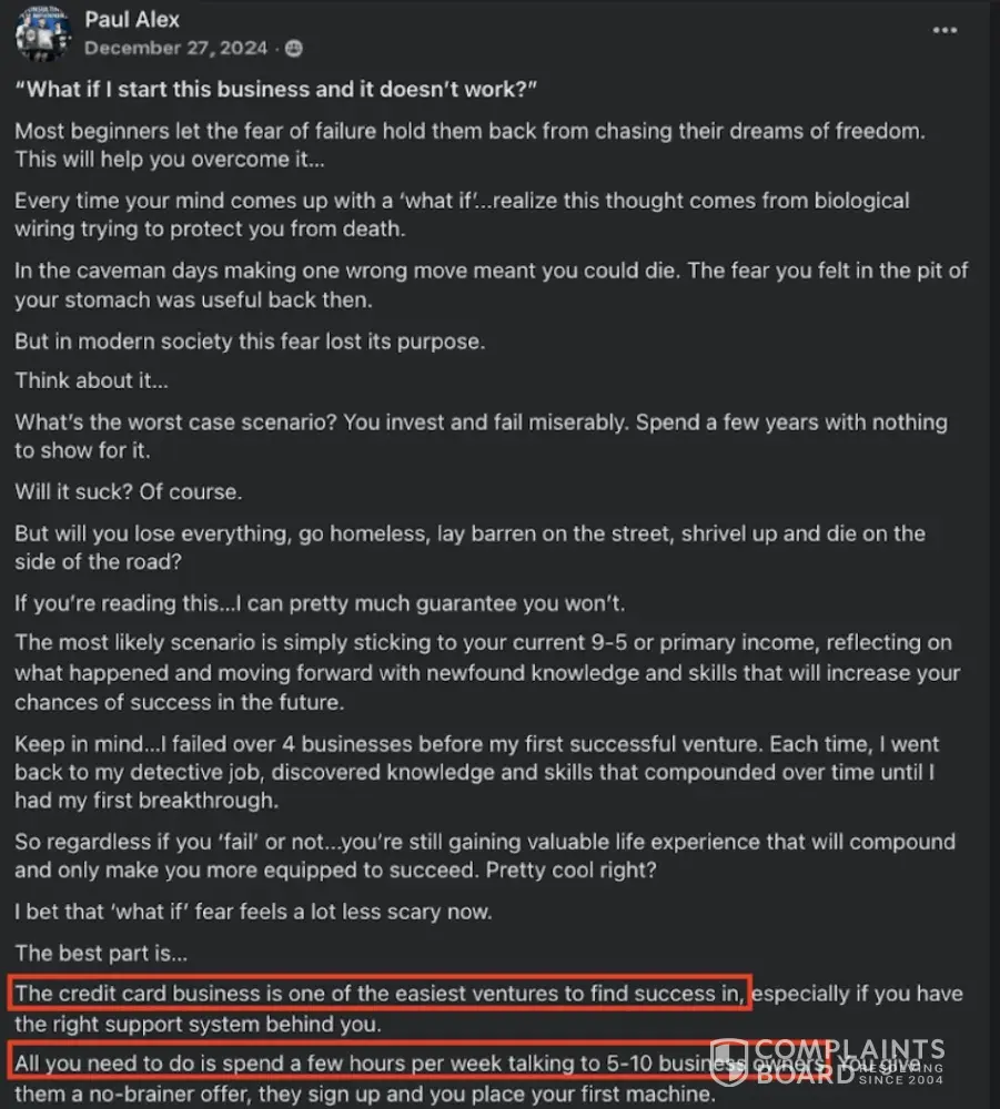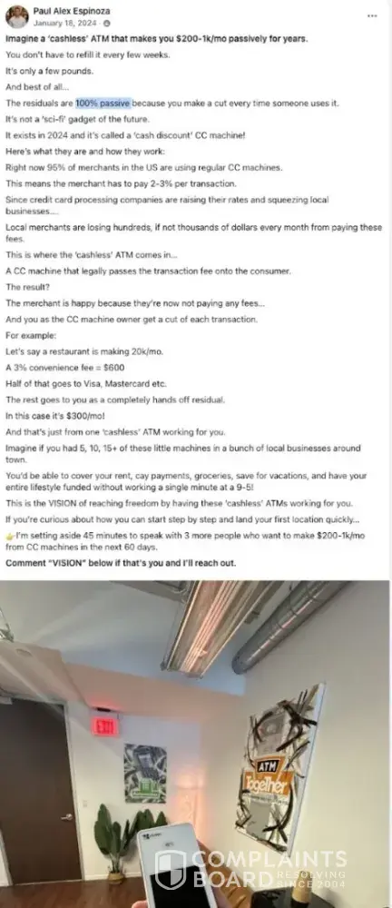 Paul Alex Espinoza (@paulalex, Founder of Cash Swipe), his sales team, and his partners at Paybotx knowingly scam many out of tens of thousands of dollars to this day, selling an elaborate "done-for-you", "100% passive" income business opportunity since 2023. They have systematically deceived people of expected results, incentivized positive reviews, suppression of negative client feedback online, misrepresentation of risk, misrepresenting typical earnings claims by cherrypicking select testimonials among 1,800+ clients, and advertising their self-proclaimed "expertise" through undisclosed partnerships and paid promotion. Over the years, they've also shown a concerning pattern of frequent business name changes, (aka. Cashless ATMs for Beginners, Merchant Automation, Residual Income for Beginners) and shut down their adjacent "passive income" businesses with ATMs (ATM Together) and a crytocurrency automation scheme with Bitcoin teller machines.