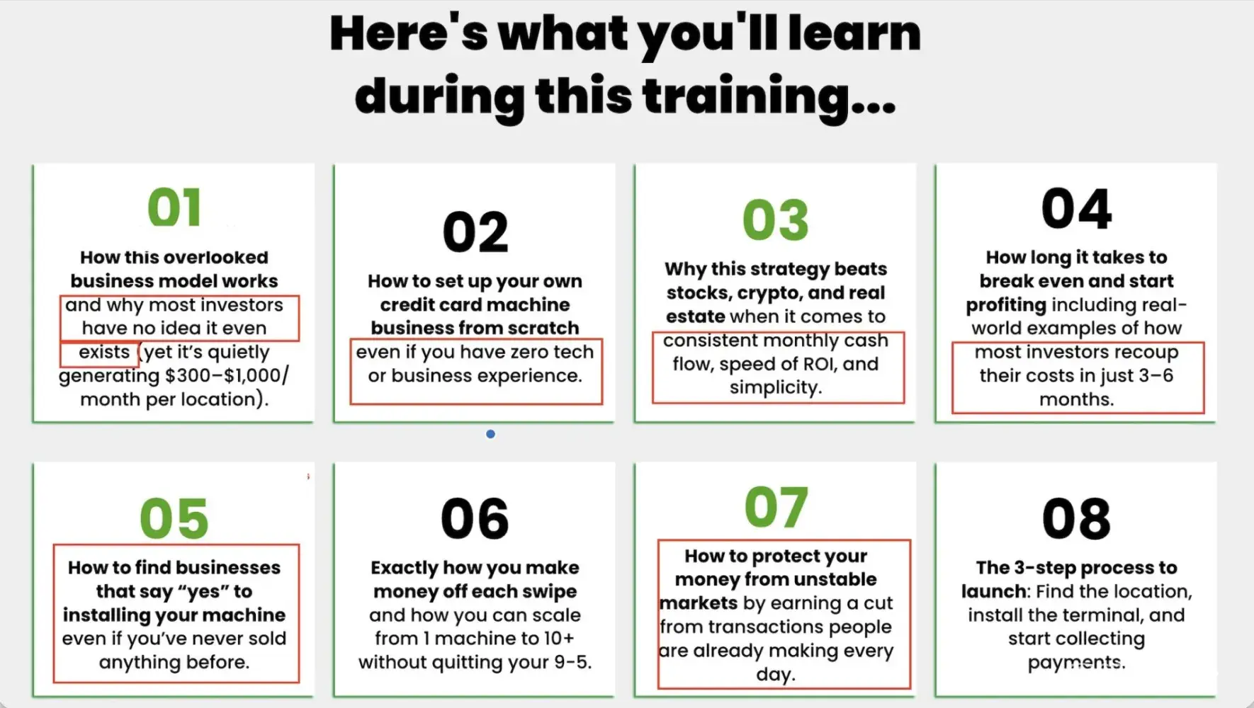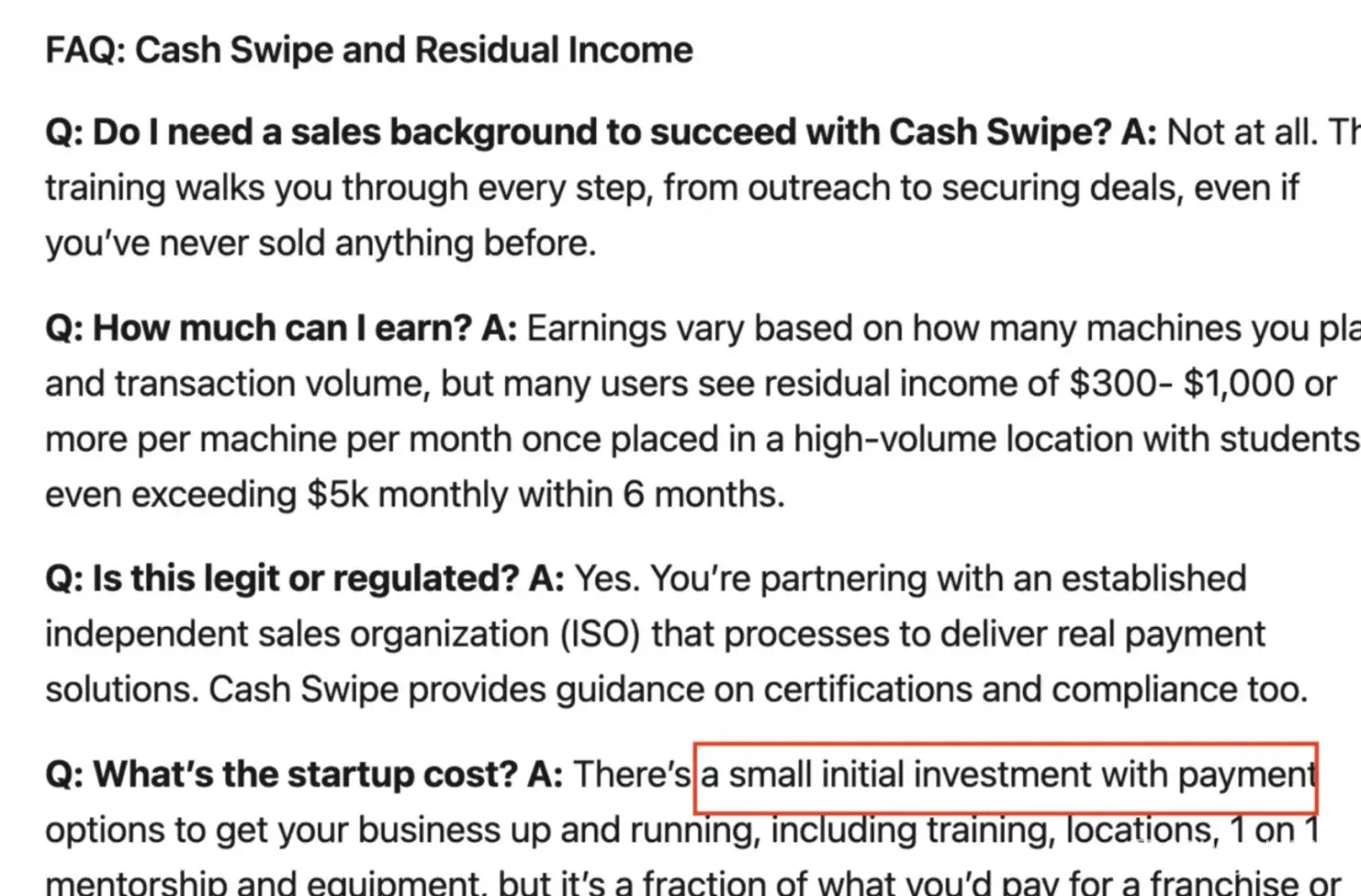 - What about their "all-inclusive" claim? Are they transparent enough about "all-inclusive" risk hiding behind the disclaimer? Even their program, which they say is "low-risk/almost impossible not to succeed" and beginner-friendly diminishes the nature of the industry and what they fulfill. Yes, the merchant services business model is legitimate, but it takes considerable time and effort, and is location-dependent for being such a "massive blue ocean". The nature of this is diminished when the company advertises "most investors [working with Cash Swipe] can expect to recoup costs in just 3-6 months". Operational costs...or the upfront cost of $15K+? Using the merchant services business model does not diminish the separate (and considerable) risk involved with financing options Cash Swipe recommend to cover Cash Swipe's own illusionary cost of entry into a "little known" business opportunity (see OPM funding excerpt in previous post). And yes, their word choice is intentional.