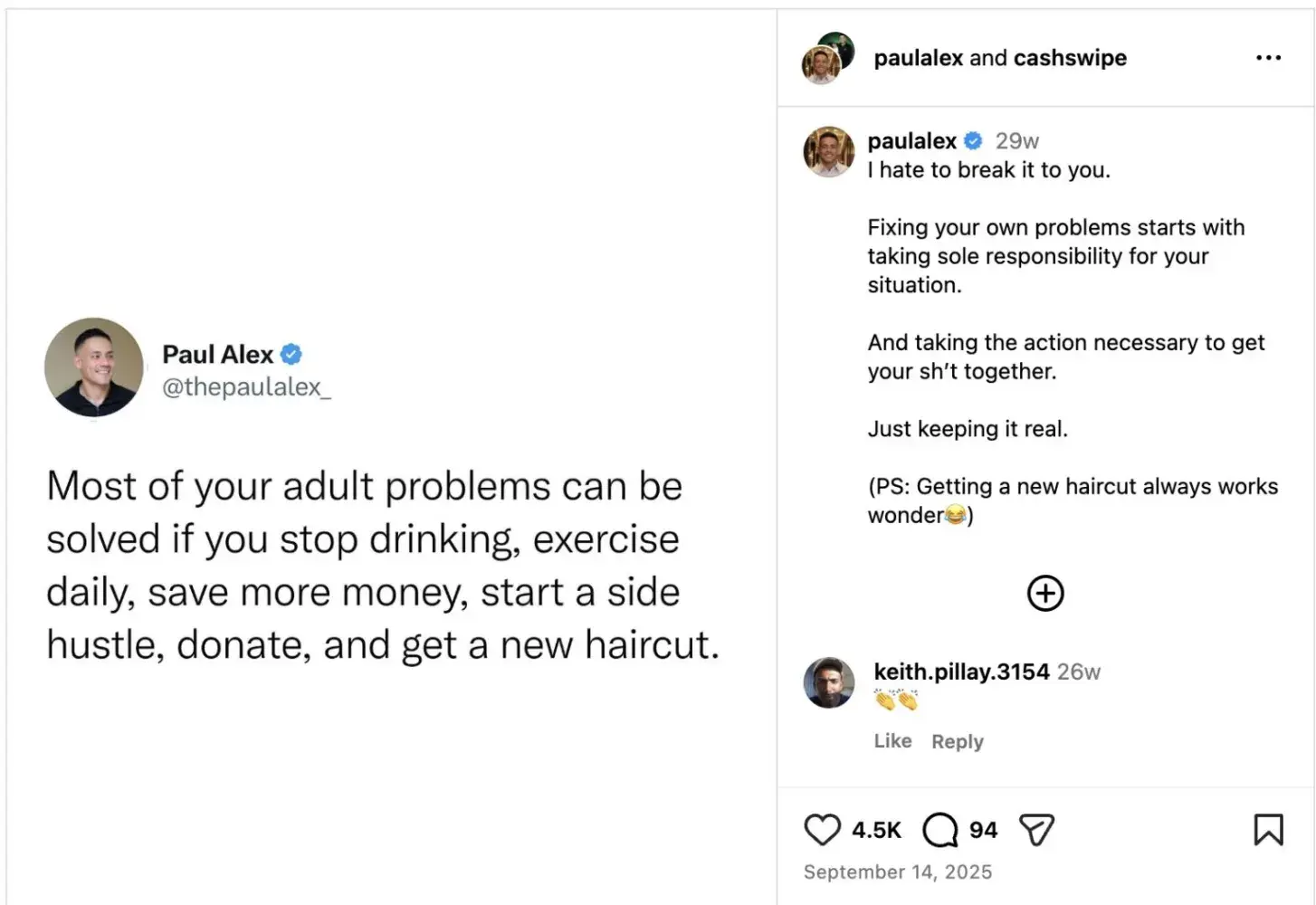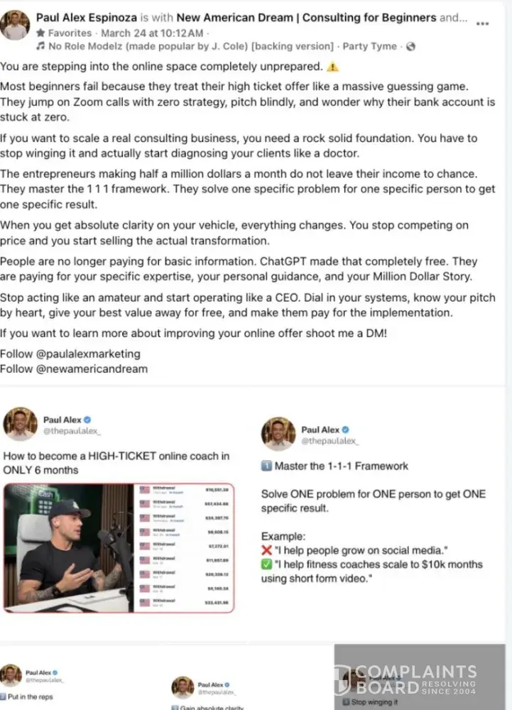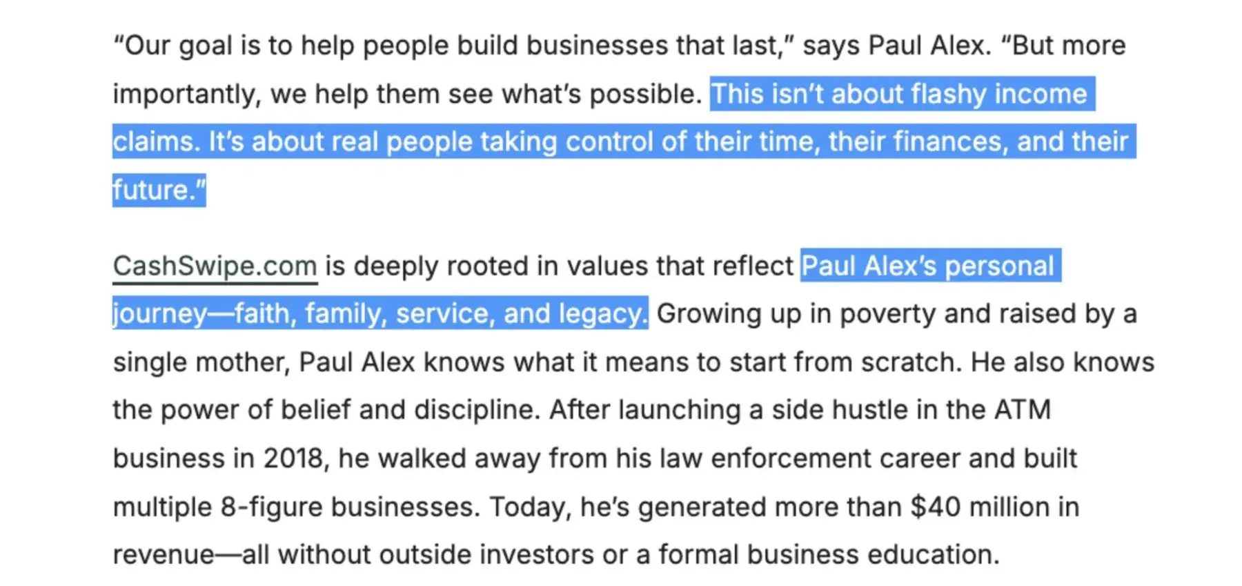 To this day, I suffer ongoing financial damages, reputational harm, and psychological harm from with Cash Swipe's business opportunity scam. I dread waking up, knowing a nightmare persists feeding another's dream. Paul Alex really needs to reevaluate himself since he thinks getting himself a nice haircut is more important than solving very real, very extant problems from his negligence. For someone who insists he's helping people and is a "man" of "faith, family, service, and legacy", his behavior is dishonest, delusional, and an insult to people who placed their trust in his lie.