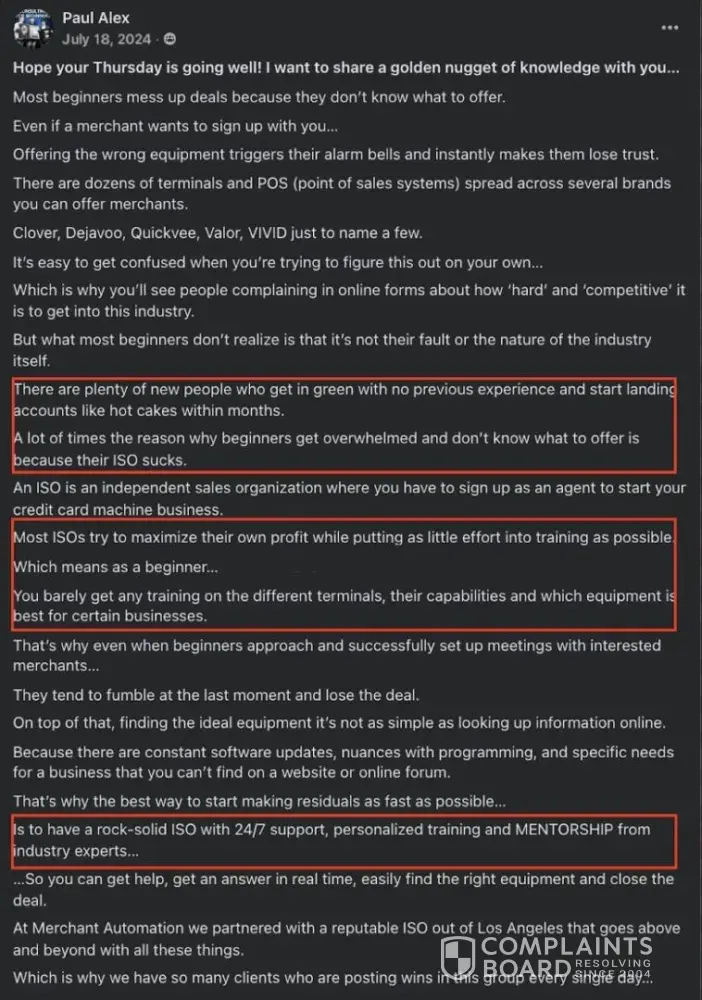 ..so what exactly justifies Cash Swipe's upfront cost, then? In their words, they're “the only program online that will help you build your own credit card business anywhere in the United States”. Saying their program's core features aren't provided by the bad guys, other ISOs who supposedly want to "maximize their own profit" is blatantly misleading. In fact, it's a big slap to ISOs doing fair business practices, who have industry veterans who've not only been in merchant services longer than Paul Alex himself, but also work harder to provide smarter, innovative solutions like their own POS solutions, and workable integrations beyond Clover/Valor/Dejavoo - fairly basic expectations (and limited in practice) for an ISO's product catalog.