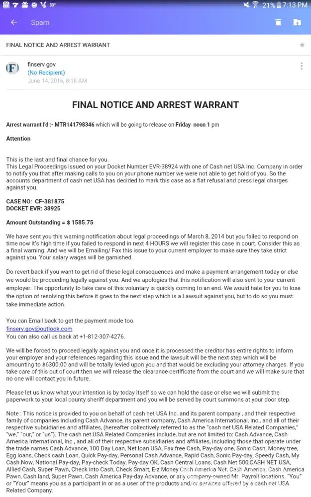 As of today rather than chasing you for money Cash NET USA has simply decided to write this money as loss & declared to be stolen by you & wants to press legal charges on you & on your Social security number.