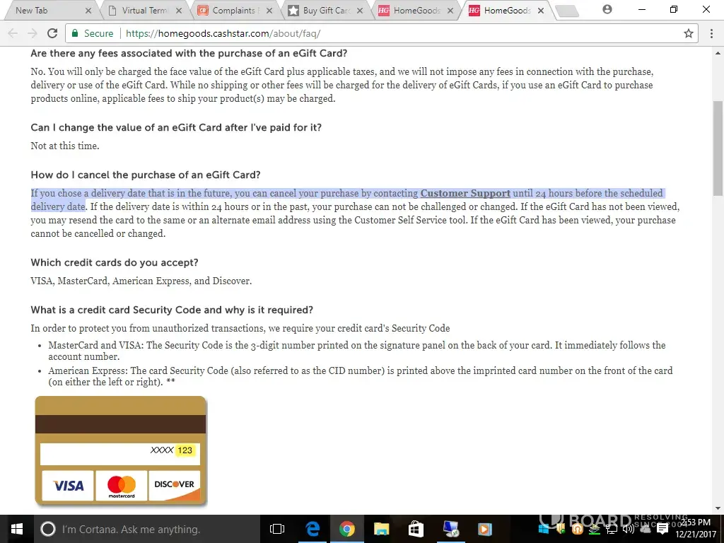 Today, 12/21/2017, I purchased an eGift card to Home Goods via the website homegoods.cashstar.com for $100 to be delivered 12/25/2017. After reading reviews of many people never receiving the full amount paid for the gift cards on BBB, I promptly called customer service, same day, 12/21/2017, to cancel my order and get a refund. I spoke with customer service and the gentleman said I could not get my refund. He provided no reasoning except that he could not refund me. I read the portion of the contract, also seen in the FAQs provided on the website, that it states if an order is canceled more than 24 hrs before the scheduled delivery date, you may receive a refund. I called 59 hours before the scheduled delivery date. Imagine my shock that I am reading the information provided by Cash Star and customer service is telling me that I can't have my refund just because. I was told to call Home Goods and given a number. Customer service with Home Goods told me that they have absolutely nothing to do with Cash Star so I was knowingly sent by Cash Star to a dead end solution. I filed an official complaint with Better Business Bureau and my next step is to post this information on Facebook and Twitter to let everyone know that Cash Star is another scam service.