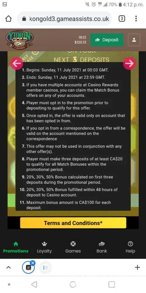 I just deposit $100 yesterday and the promotion said 20% bonus for $20 deposit 30% for $50 deposit and 50% for $100 deposit and all i got was $20 bonus when it should have been $50 bonus! I tried to contact them and every time they kept saying they arr transferring me to a colleague then no one comes on, only today around 7pm i got through to them. They kept saying that I got the correct amount and that I should feel free to chat and ask them next time! It is misleading and I urge anyone who are thinking of playing to choose another casino ...this company is the worst at trying to cheat people of what they are truly entitled to!