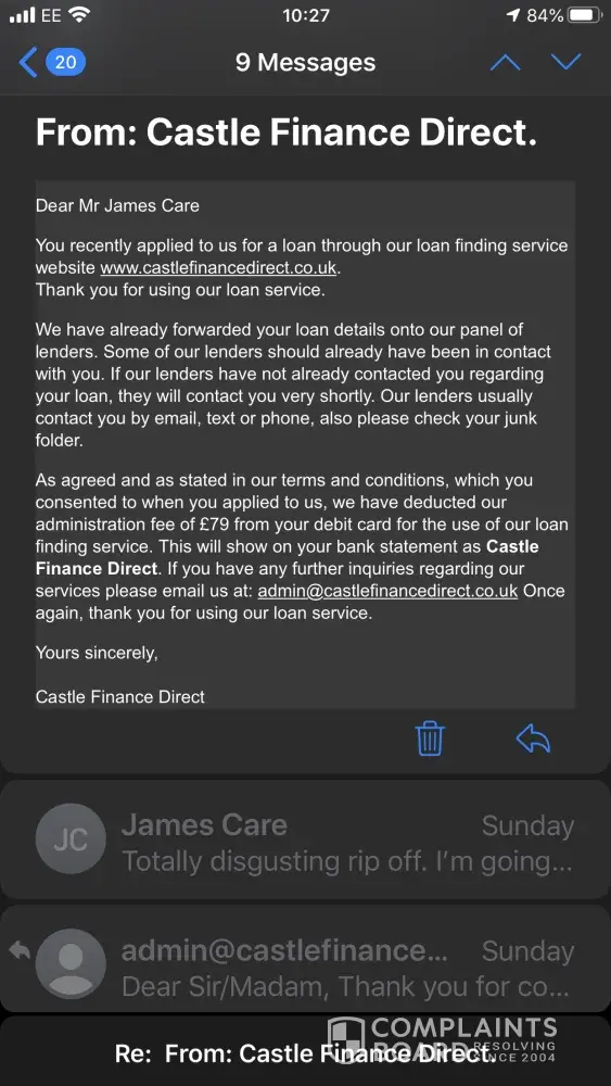These people are scammer it's a clone website of the real castle finance company in dorset. They take the 79 pound admin fee and provide no service.