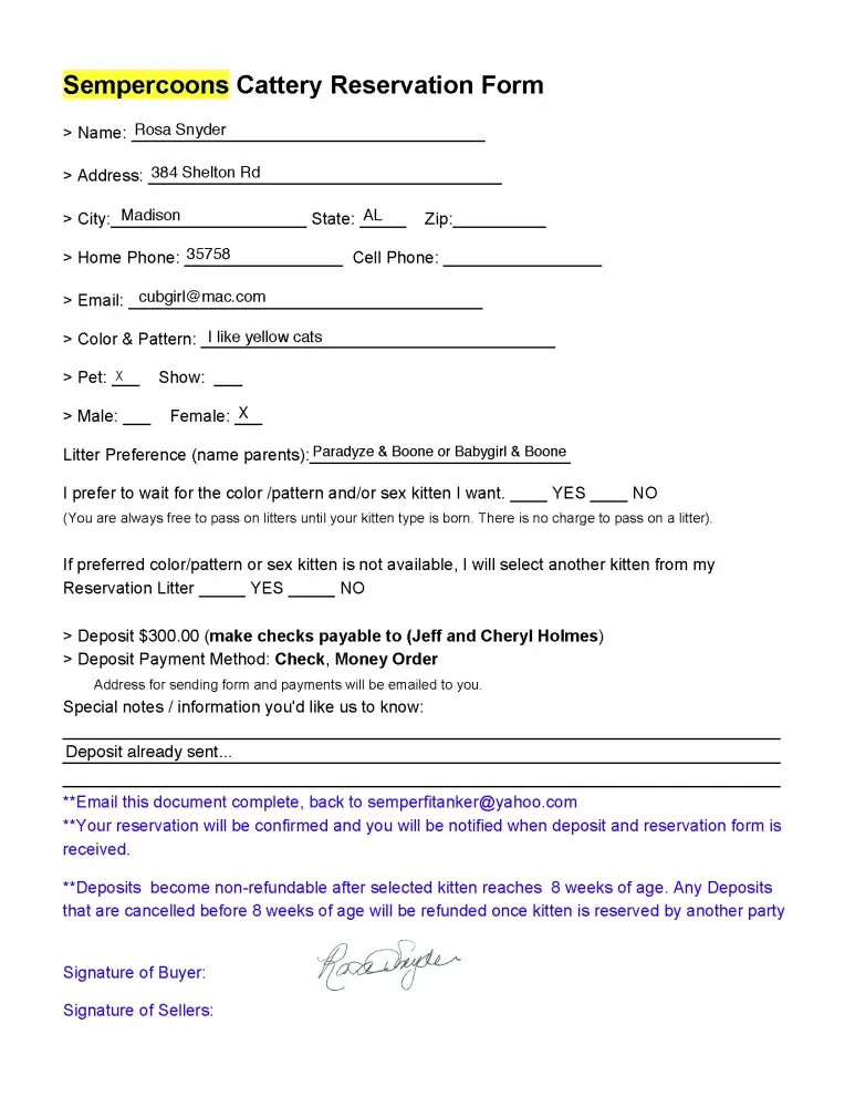 Tried buying a cat from these people. On Jun 16, 2014 I put a $310.00 deposit for a female cat. Here's my experience: 1) They informed me on Jul 9 that pick up was Jul 4. They would not meet me near their home (30 miles) on July 12 at LaQuinta 2) I said would be traveling with my dog. They complained & requested for me to leave my dog (standard poodle) at...