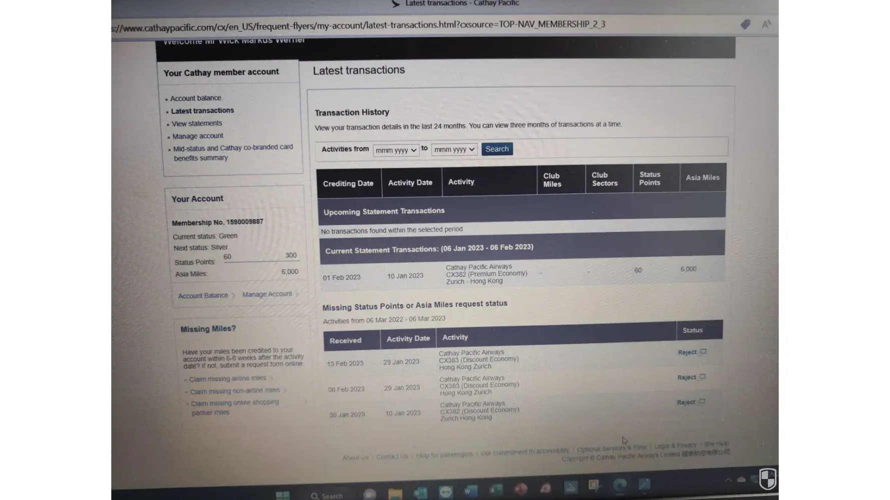 Membership no [protected] Markus Wick - Claiming of missing status miles points: