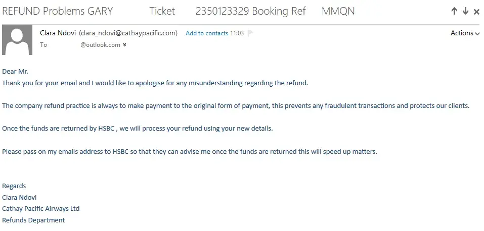 Finally Cathay Pacific Reservations said the refunds department had sent my refund to my Old Closed HSBC account Not what I was informed twice before by them, and I should call the bank myself and ask for a Cheque to be sent to me, Literally washing their hands of it!