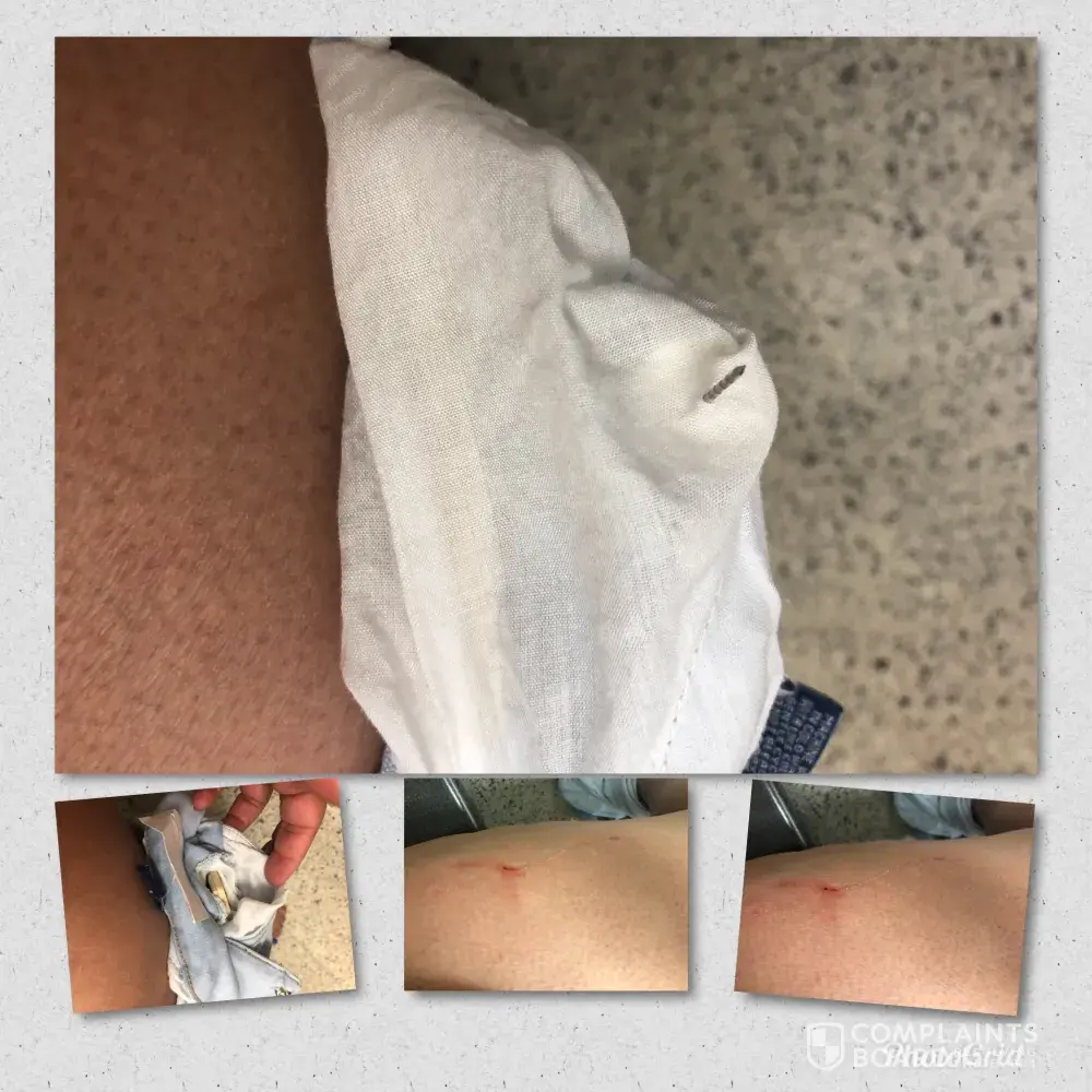 On Sunday, October 7th at approximately 4:02, I was injured in your store by a clothing sensor. Someone had stuck the sharp pin part in the back of a pair of jeans that I was trying on. In doing so, the pin scratched and stuck in my leg. There was quite a bit of bleeding and I do have pictures of the incident. The salesperson filled out the accident form on the computer that day and sent it in. I went the next day to get a Tetanus Shot at my doctor's office which he informed me that was the right and best thing to do. To this day, I have not heard anything from the Corporate Office. I called Corporate on October 15th and briefly spoke with Ms. Hicks who said they did not have any way of getting in touch with me, although the information was given in the store. I gave her all of my pertinent information and to this day, they still have not called to discuss the situation. I have a permanent scar and had to spend money for the doctor's visit. I made my last call to the Corporate Office this morning, October 22nd and the young lady that answered the phone didn't seem too thrilled and transferred the call to someone's voice mail. I now see what needs to be done.
