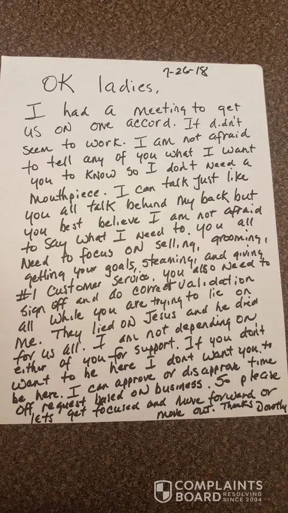 I've Worked With My Store Manager Dorothy Cooper Since September 2017. On Several Occasions She Has Done Unprofessional & Imature Things As A Store Manager. I'm Young & I Don't Disrespect My Elders So I NEVER Said A Word About Anything She Has Done To Me. She Talks About Me To Other Associates, She Snatches Things From Me, She Has Made Fun Of Things That I Tell Her, She Always Speak On My Situations & Be Sarcastic About It. She's Written VERY Rude Notes To All Associates Because One Associate Said Something To Her About Talking About The Associates Son. On The Day I Left She Wrote Under My Name On The Cashier Report In Quotation Marks "Retired, Had Retirement Party" All because Some Other Associates & I had Lunch Together, But She Wrote "Resigned" On Everyone Else Name Who Had Left. She Just Mistreat Everyone That Works For Her & It Isn't Fair At All. If You Need More Information feel Free To Call Me Or Email Me. [protected] Or [protected]@gmail.com