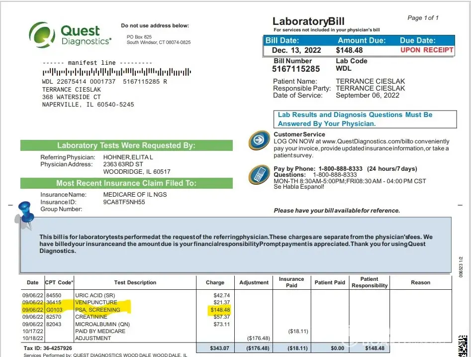 I recently had a PSA blood test and the insurance only covers one per year, so Quest said that I had to pay for the test. The problem is that they charged me $148.48 because that's what they would have charged the insurance company. However, on their website, they show that the PSA test if I ordered one myself is $69. Since the insurance company didn't pay them the $148.48 and probably would have paid far less if it had qualified, they are charging me a $79.48 premium over the $69. Their argument is that what they would have charged the insurance company, but the insurance company didn't pay them anything. I can understand this concept if the lab test was one that only a physician could order but since I could walk through the door and get the test for $69, I don't see why they expect me to pay the full insurance price when they would not have gotten it anyway.