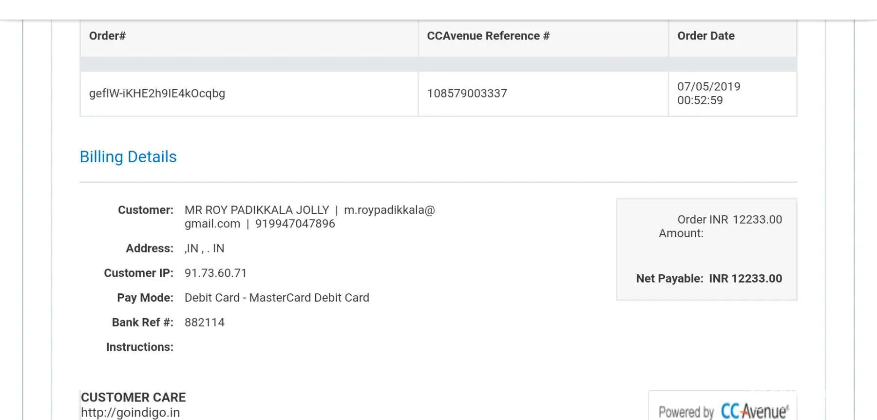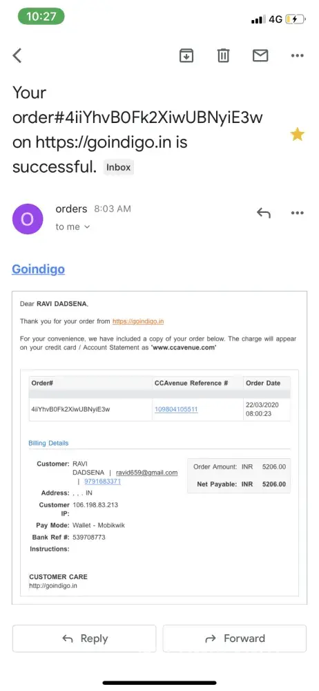 The confirmation mail from ccavenue is given belowOrder no. D33658270411 from ccavenueInbox
