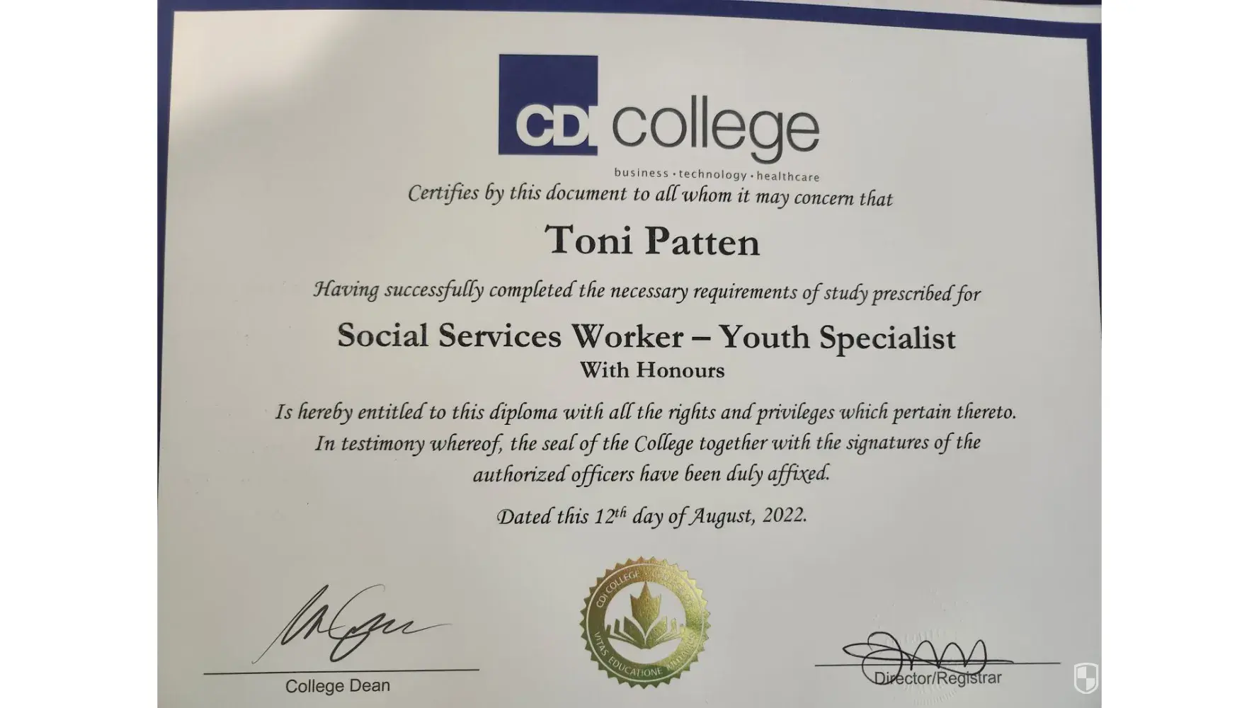 CDI College Graduation award certificate