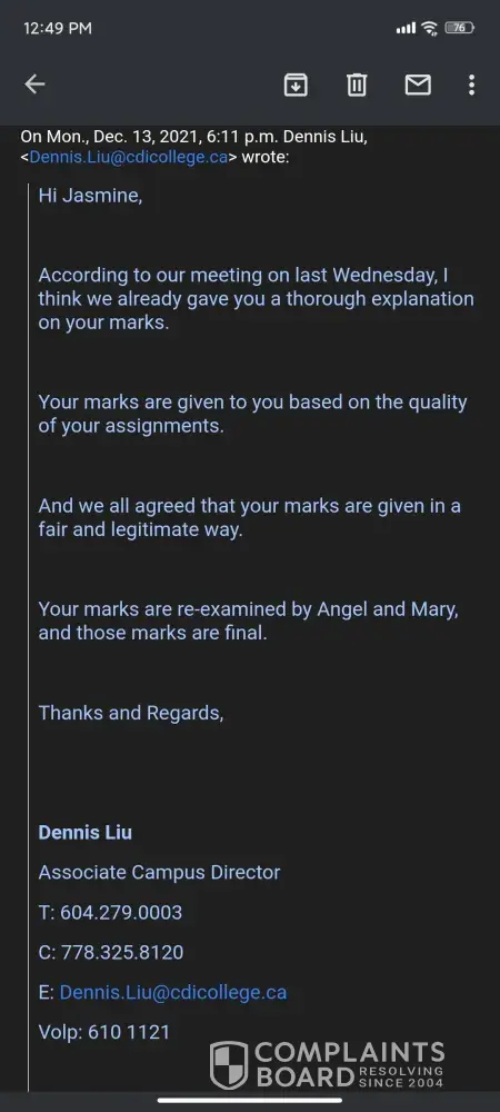 For starters the school can't even get a teacher that teaches us the proper courses we have a teacher currently teaching us communications for counseling who is a computer engineering student he knows nothing about Communication that has been giving us the incorrect answers for our exams. The staff working in the office Diane and rachana Ravel Do not do their jobs when you bring forward to the I Issues they brush it off so they're doing their job look at us a proper teacher but then we end up with teachers I don't know anything. Secondly we end up having our personal and confidential medical and criminal records check shared with the entire class as rashawna rebel has repeatedly forwarded people's confidential information to the other 18 people in the class pull in the class this is a breach of confidentiality. If something isn't done soon I will be contacting my lawyer and Legal action will be taken against CDI college.