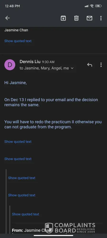 I always receive an Email with a different person asking me to pay when I already dropped my course a long time ago. It was really hard to get a hold of them and they don't relay the message from one person to another. I already paid for the first quarter and attended for two months only now they want to get another payment from me when I cleary sent an email and called a million times to them that I already dropped my course. When I was trying to drop the course they were very hard to reach. Nobody will answer back through email and phone.