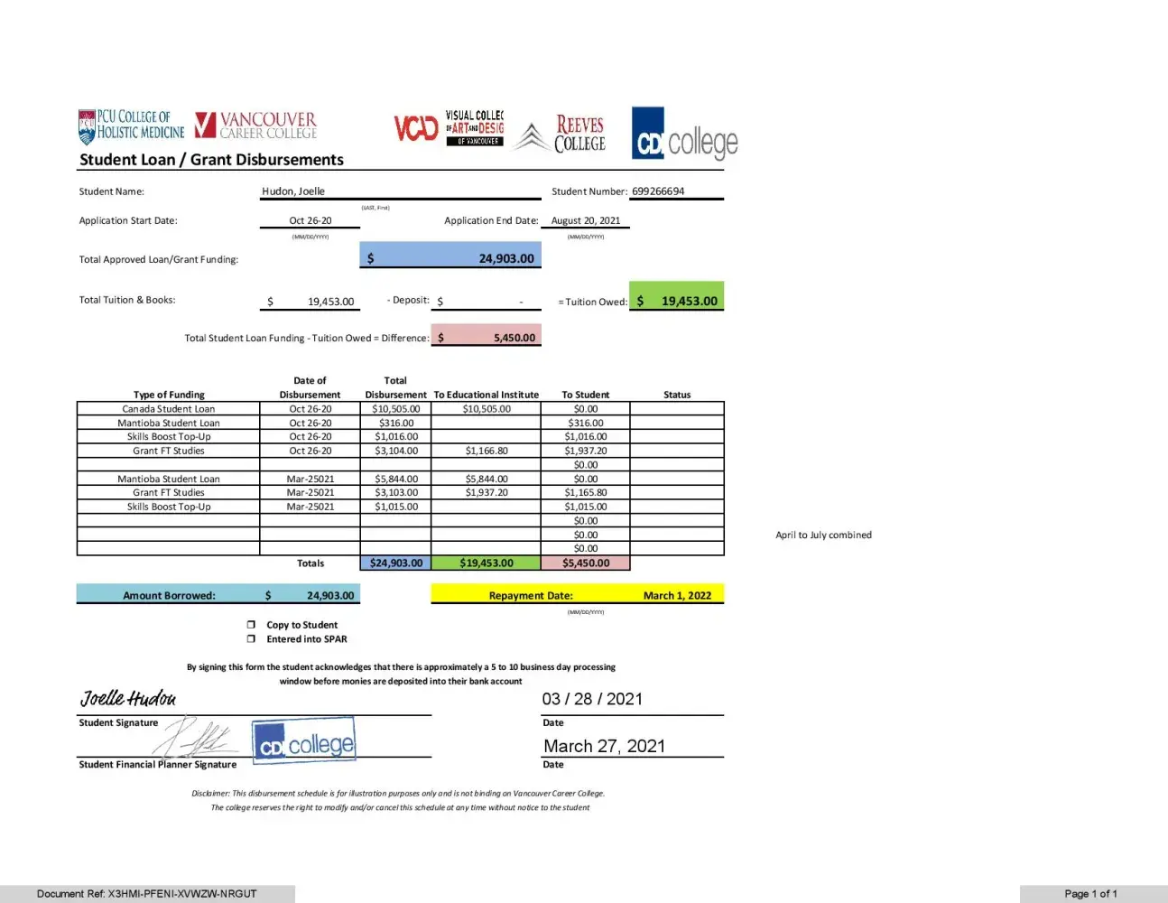 I have spoken with Manitoba Student Loans, and they assured me that all my tuition has been paid in full for the first 2 semesters. The $5450 was confirmed for me to live on while I am a student. They also recommended that I reach out to you for help with this matter. I am concerned that I am caught in a scam. When I enrolled in the course, I was advised that I would graduate as a certified Cyber Security Specialist, I have since discovered this to be false. The total amount that I was expected to pay from Oct 26, 2020, to Aril 20, 2022 would have been $33, 506 (see attachment). I no longer have access to my account; I no longer can continue with my studies as they have suspended me.