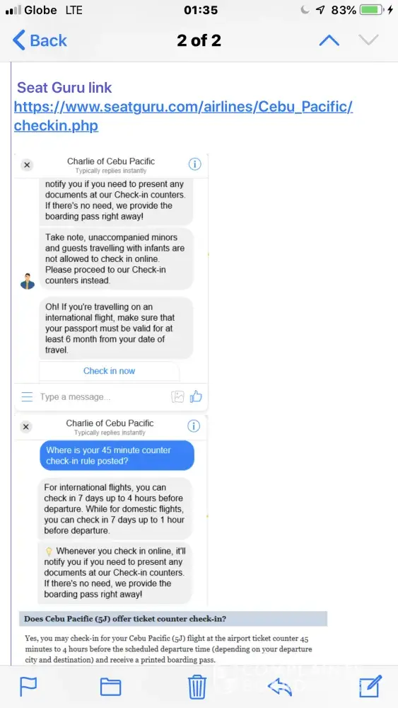 minute if need be, in their check-in requirements and not ballpark ranges of hours and days especially when it comes to check-in desk options and especially when anticipated foreigners might fly Cebu Pacific where native nuances, expectations, unwritten yet known only to the locals may be misconstrued. It would also be best if a search engine or a FAQ webpage could be available on the Cebu Pacific website, NOT a Charlie Chatbot, which doesn't know about a 45 minute rule either. Above all, it is unacceptable for this infamous 45 minute rule to NOT be posted ANYWHERE on Cebu Pacific website or in their Terms and Conditions. It is very embarrassing for Cebu Pacific when that crucial bit of information has to be entered into Google and be found on a fringe website run by Trip Advisor. It is more humiliating for international tourists because they pay for Cebu Pacific's shortcomings and have their personal itineraries ruined. Â