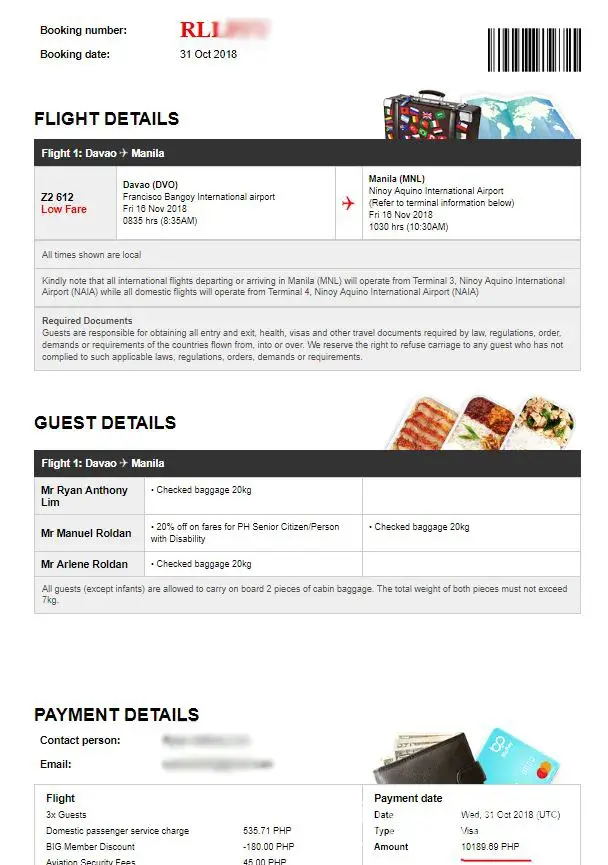 August 19, 2018/ Flight 5J 378/ Booking ref: ML3TJR/ Tans. ID: [protected]