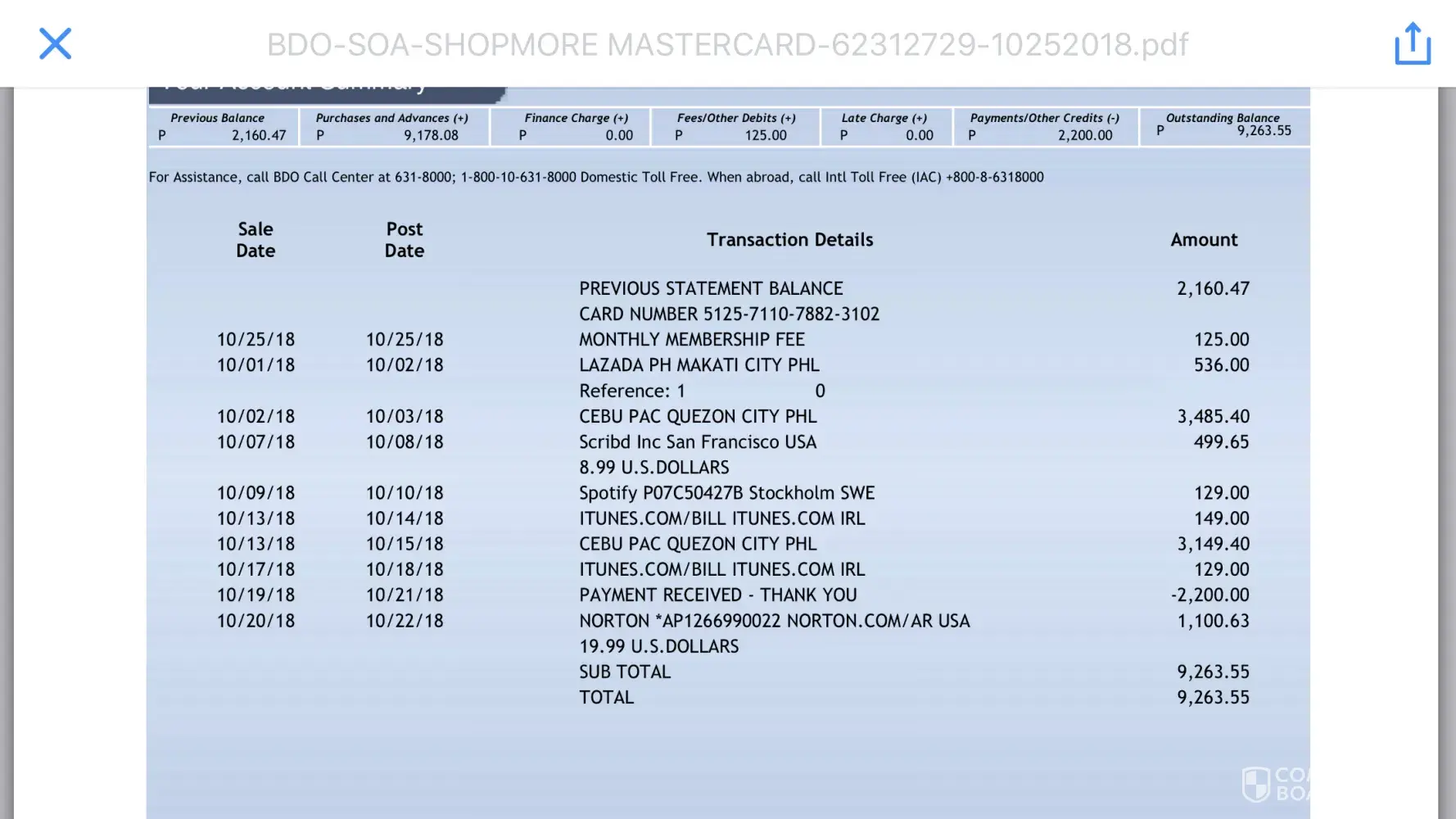 However, upon viewing my billing statement dated 10-25-2018, I noticed that the transaction I made on October 3, 2018 was charged on my account in the amount of Php 3, 485.40.