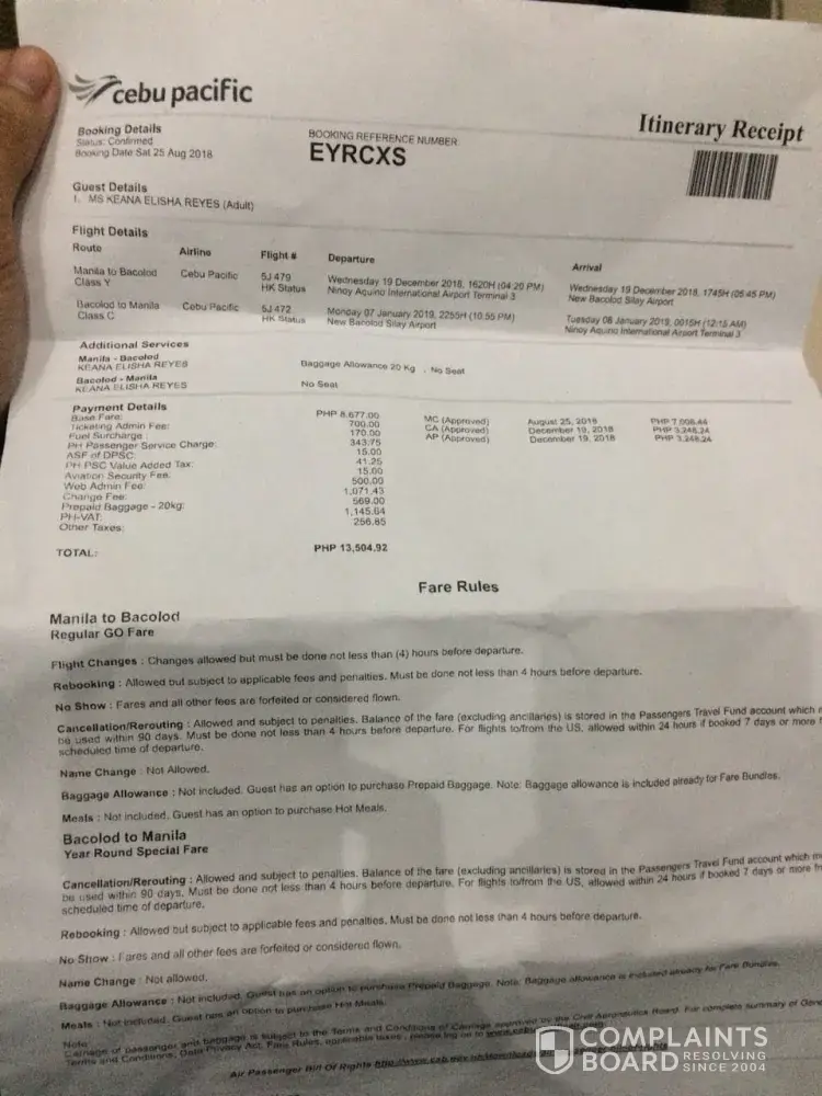 Justify they never give us value of urgency. Ang bagal nila. I dont want to argue instead I paid the rebooking fee, and penalty total of php6496. 48.. Instead that amount is for our monthly rental and christmas gift to my daughter n family in rovince do you think this is fair?, consideration sa situation namin. I'm requesting for refund...
