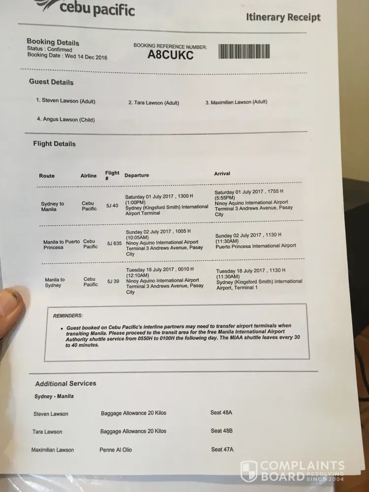 We would like Cebu airline to compensate us for these accommodation expenses, as we will now have to find alternative accommodation.