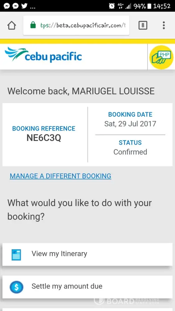Cebu Pacific Air confirmation no. b8f1gs, reschedule of my flight