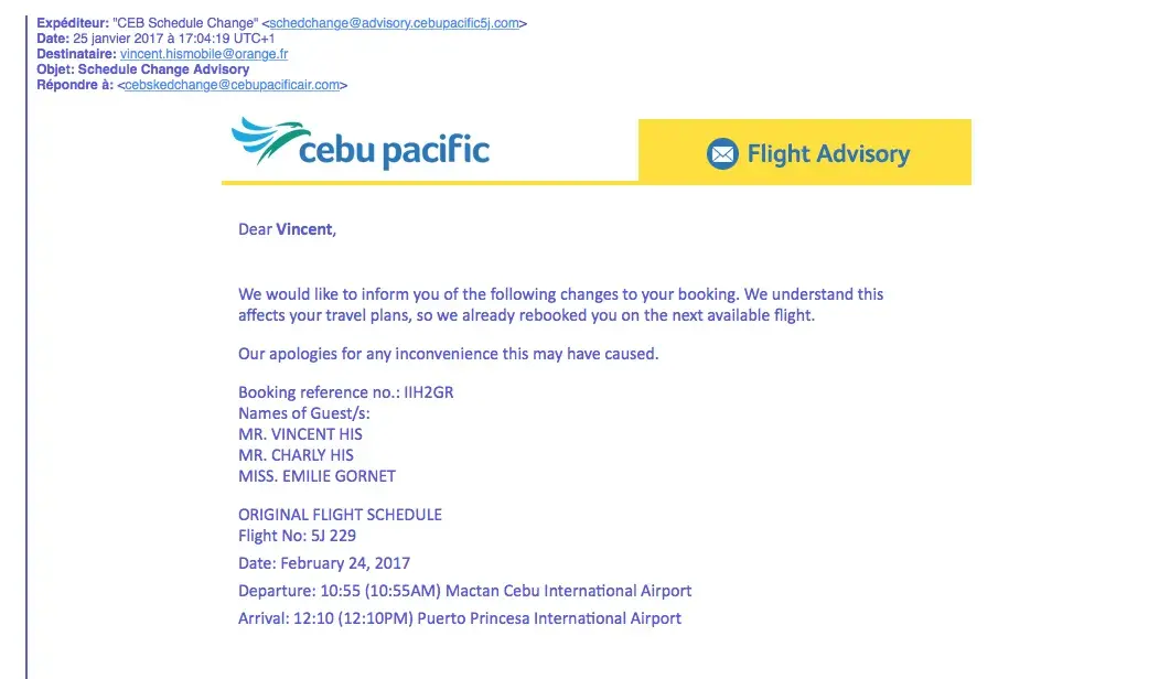 Arrival: 20:55 (8:55PM) Puerto Princesa International AirportWe would like to inform you of the following changes to your booking. We understand this