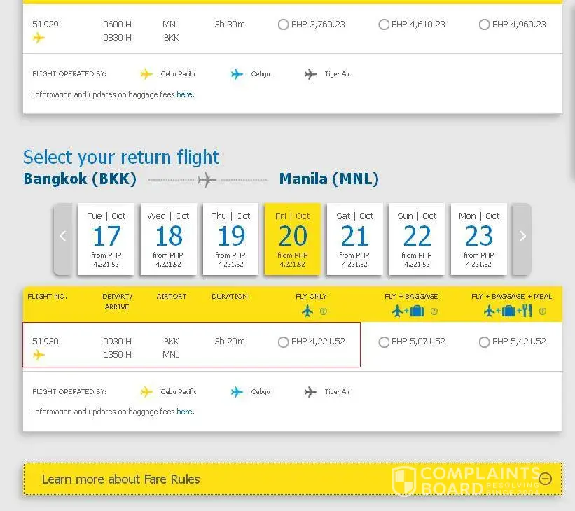 When I try a roundtrip from Oct 19-20 MNL - BKK, the same flight, 930 from BKK - MNL, costs 4, 221 PHP.