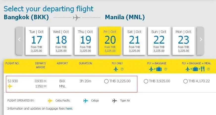 For example, as of this writing, Flight 930 from BKK - MNL, Oct 20, costs 3225 THB (4, 642 PHP).