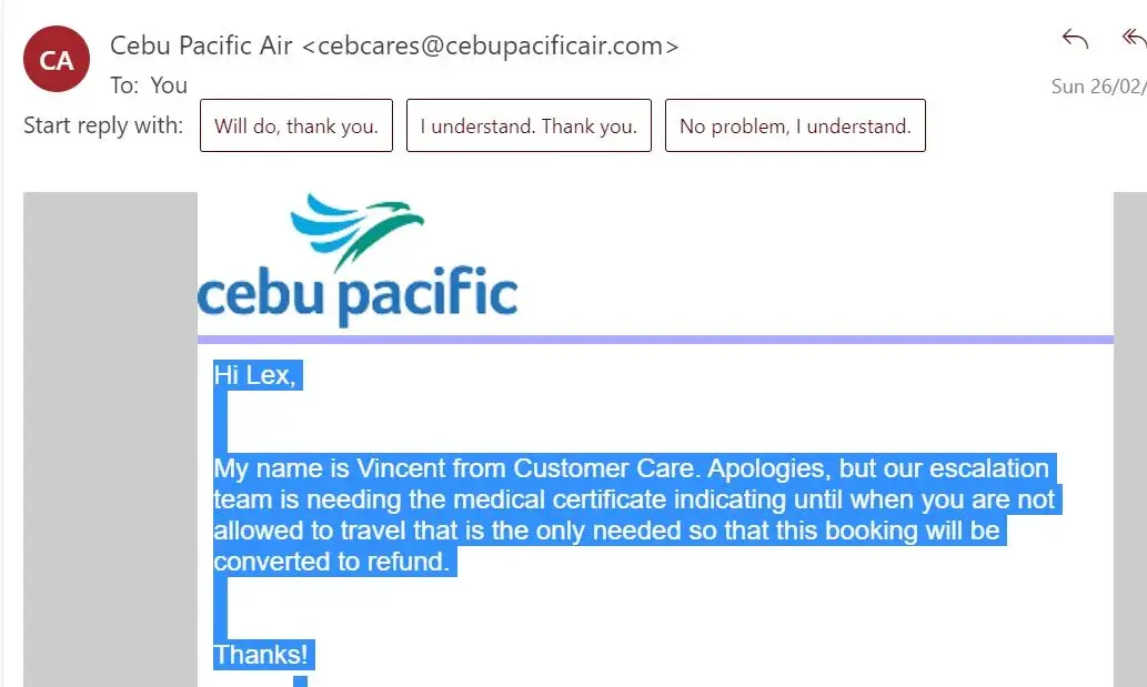 So I went ahead and started a conversation with Cebu FB customer service. I was advised to provide medical certificate which I did. However Cebupac said it needs to be time-specific, meaning how I will not be able to travel. Given the rarity and complexity of my condition my ENT could not specify a duration. I might not be fit to travel for forever because there isn't any known cure or management to my condition. So my ENT was consistent that I'm not fit to travel but she could not just specify until when because this is gonna be for the long haul.