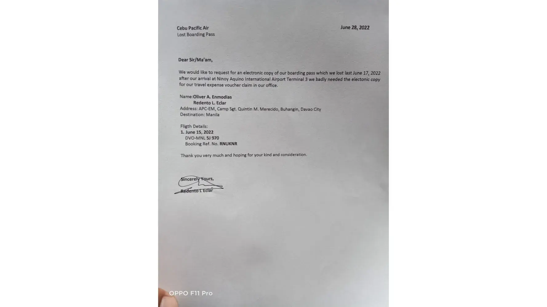 Sir/ Maam, can I request for a copy of my boarding pass for the flight I took or travel certificate to be a proof that I boarded for the said flight This will be used for the reimbursement of the airfare and other travelling expenses.