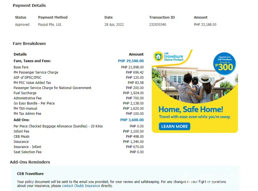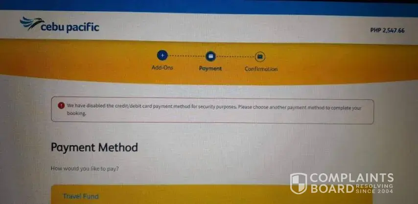 Nagtry akong maglagay ng baggage sa ticket ng Father ko last May 2, 2022. Nung andun na ako sa payment ayaw tanggapin yung credit or debit card dahil sabi nyo naka disable na credit/debit card payment for our secuties that's why napagdesisyonan namin na ipacargo na lang yung baggage nila kahit mas mapapamahal kami kasi no choice na kami kasi credit card lang ang mode payment na mayrun ako dun sa mga option na mayrun ako. In my surprise at the airport sinisingil nyo ung di nagproceed na baggage? Like what? Kaya nga kami nagpakargo kasi ayaw tanggapin ng site nyo ung payment ko tapos naka disable pa yung remove items nyo para di na matanggal ung baggage na nirequest. Sinabi namin sa desk na tanggalin na ung nakahang na baggage kasi nagpa cargo na kami sa airlines nyo but they refuse to do it! Sinabi pa na kapag di binayaran eh di sila makakasakay ng eroplano tapos pupuntahin yung father ko sa ticketing office to fix it. Without any consideration na may kasama siyang senior citizen na naka wheel chair. Where is the consideration cebu pacific? Unang una site nyo ang nagkaproblema upon payment. Mas napamahal pa nga kami kasi nag cargo kami kasi we don't have any choice gawa ng problem sa site nyo.